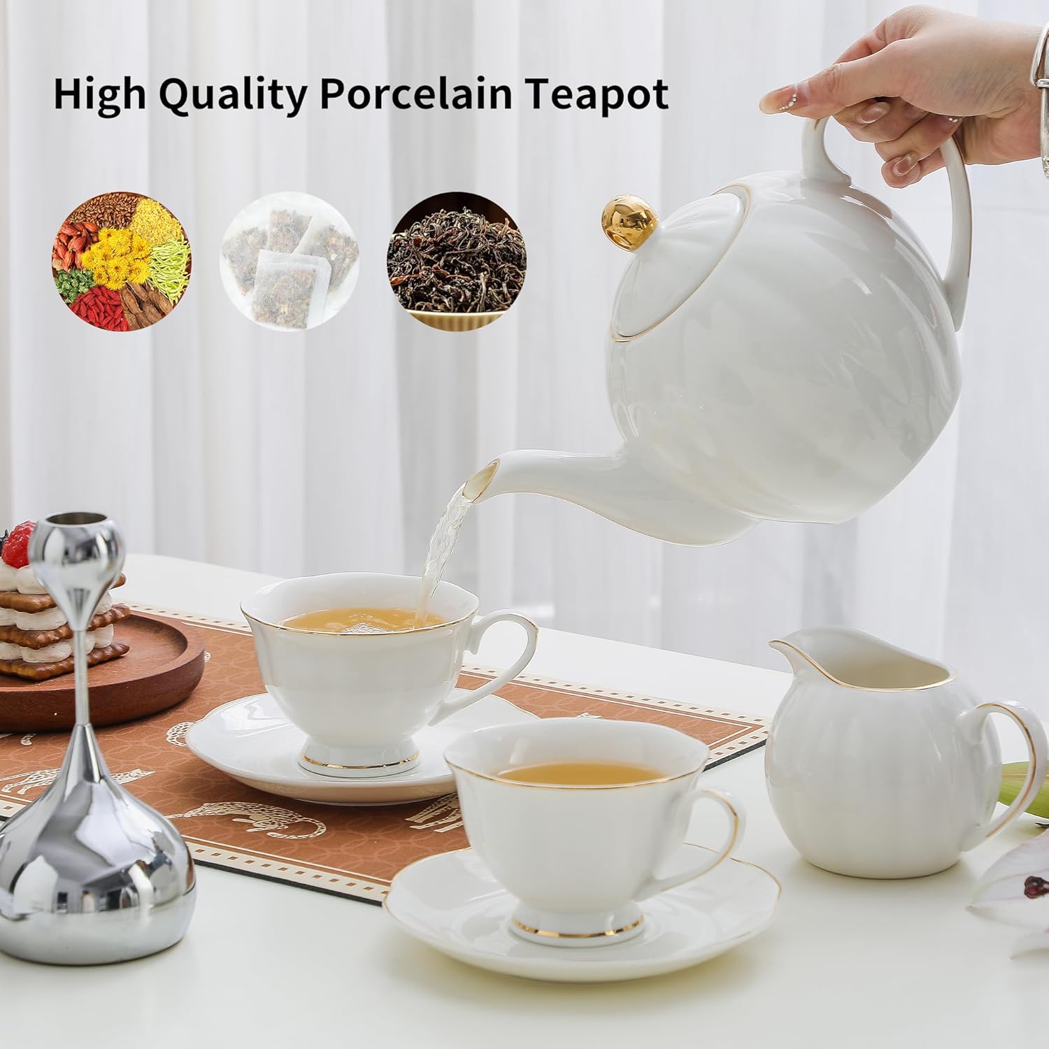 36oz White Porcelain Teapot with Gold Trim, Large Ceramic Teapot for Loose Leaf Tea & Tea Bags, Elegant Tea Party, Gift for Tea Lovers, Classic Design