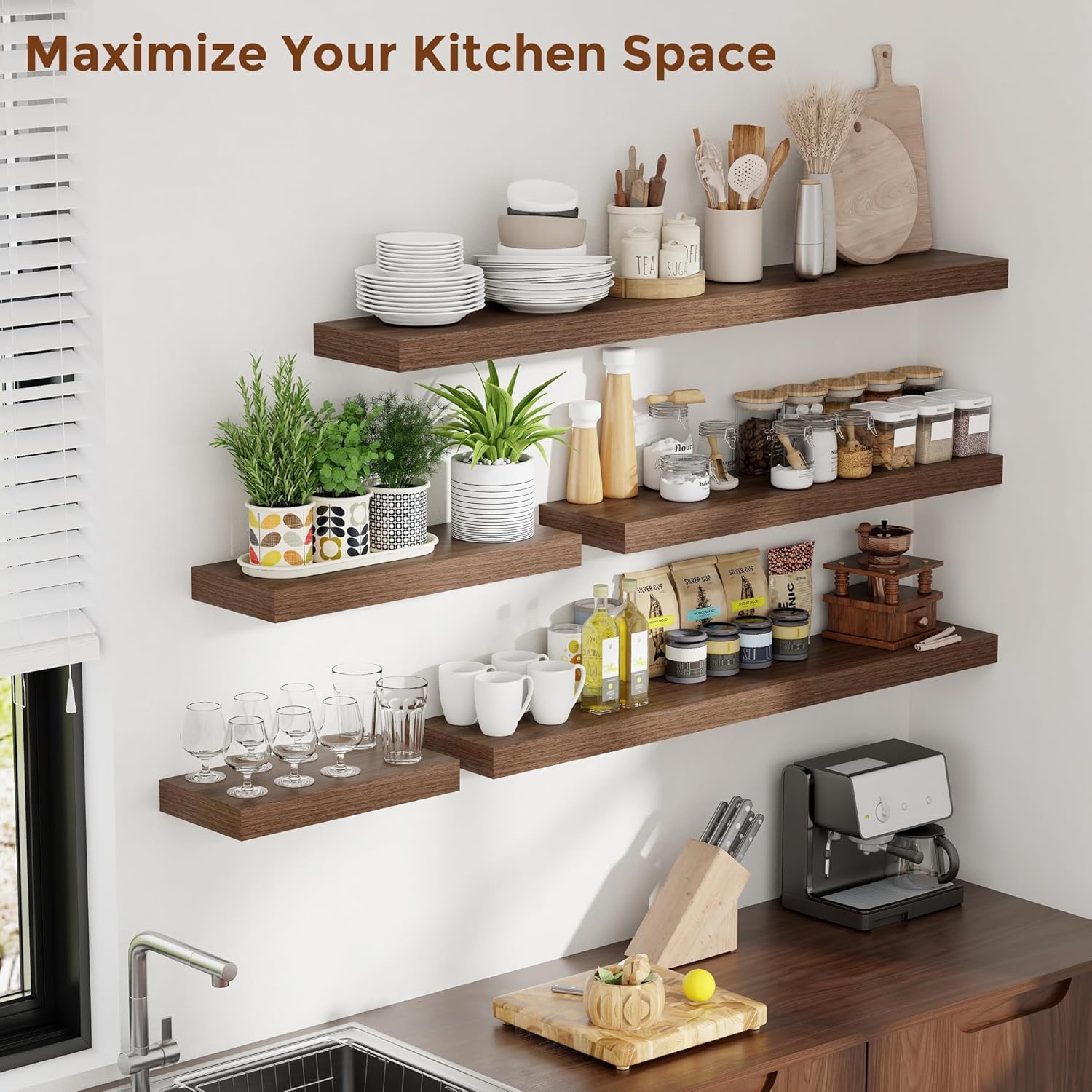 Heimlove 55 Inch Floating Shelves for Wall 8 Inch Deep Walnut Shelves Set of 2,Wall Mounted Rustic Wood Long Floating Shelf,Large Extra Display & Storage Shelf with Invisible Brackets