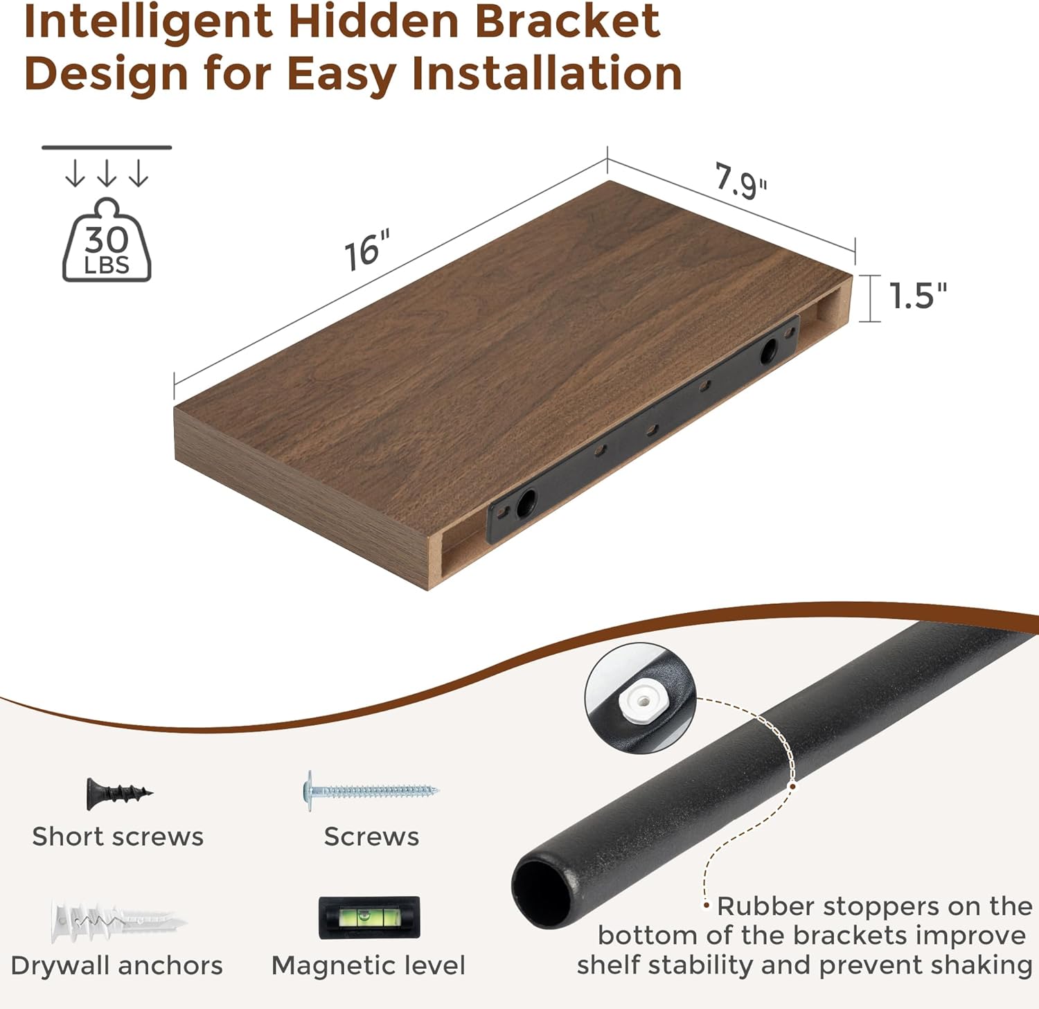 - 【Easy To Install】This walnut floating shelves not only come with stainless-steel galvanized invisible brackets, but also equipped a fixing screw at the bottom to fix the shelf on the support rod, which solves the problem of sliding and is not easy to damage, and can be used for a long time. Instructions, magnetic level, drywall anchors, and screws included.