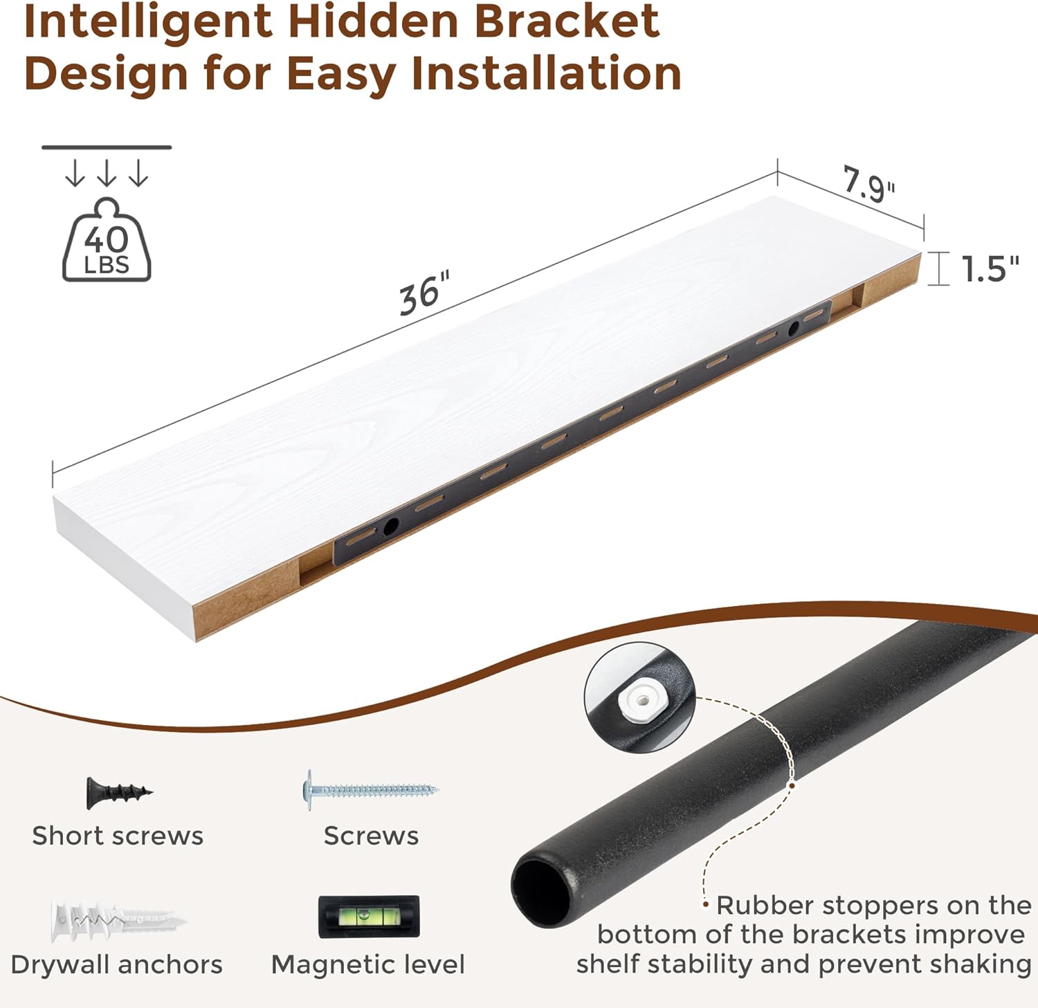 Heimlove 36 Inch Floating Shelves for Wall 8 Inch Deep White Shelves Set of 2,Wall Mounted Rustic Wood Long Floating Shelf with Invisible Brackets for Bedroom Kitchen Living Room