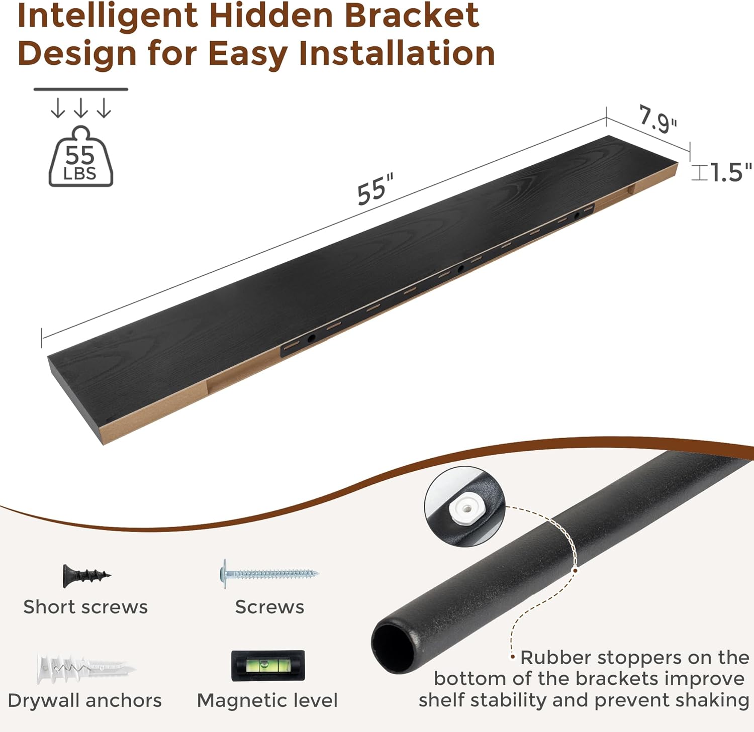 Heimlove 55 Inch Floating Shelves for Wall 8 Inch Deep Black Shelves Set of 2,Wall Mounted Rustic Wood Long Floating Shelf,Large Extra Display & Storage Shelf with Invisible Brackets