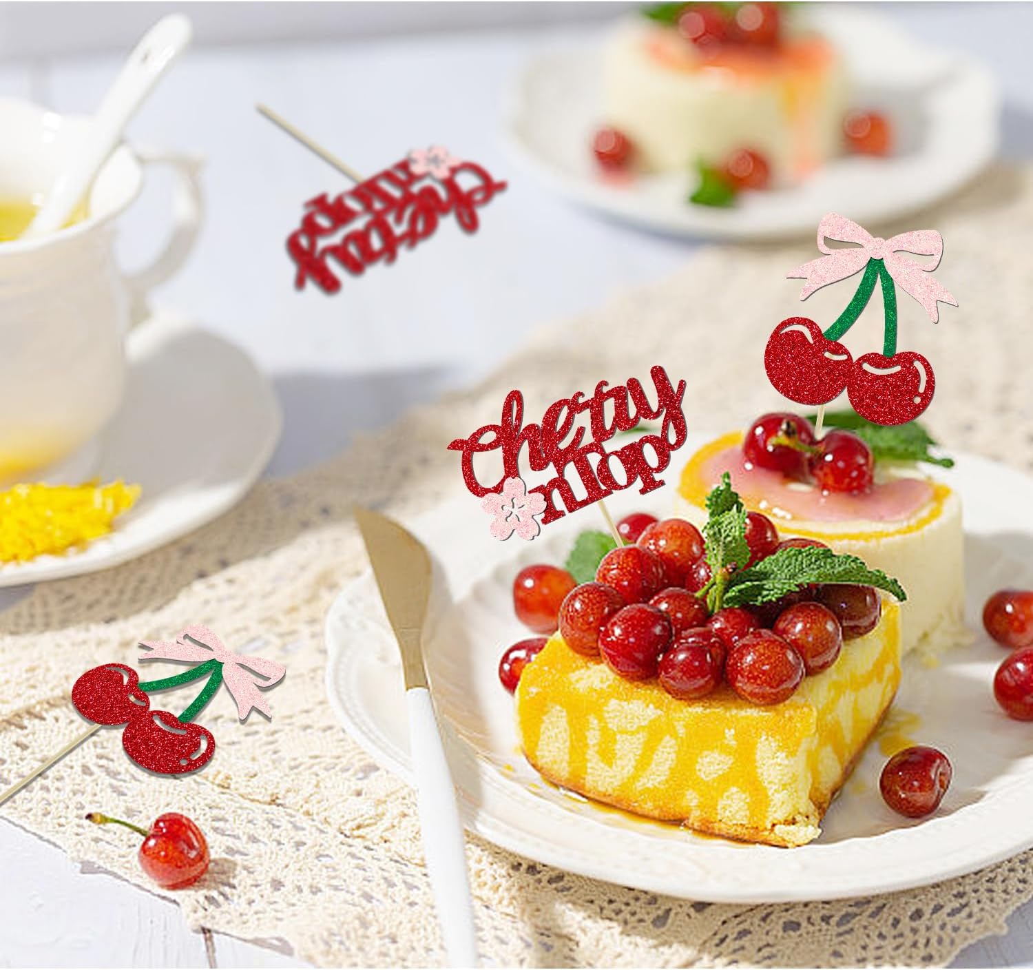 - 【Cherry Cake Topper】:These sparkling and cute cake decorations are excellent accessory for cherry or fruits party. The topper features a unique cherry design with a charming bow and delicate cherry blossoms, adding extra sparkle and cuteness. These cherry cake toppers will make your cake more attractive and everyone will love it! It's also a great photo prop to make your party more fun!