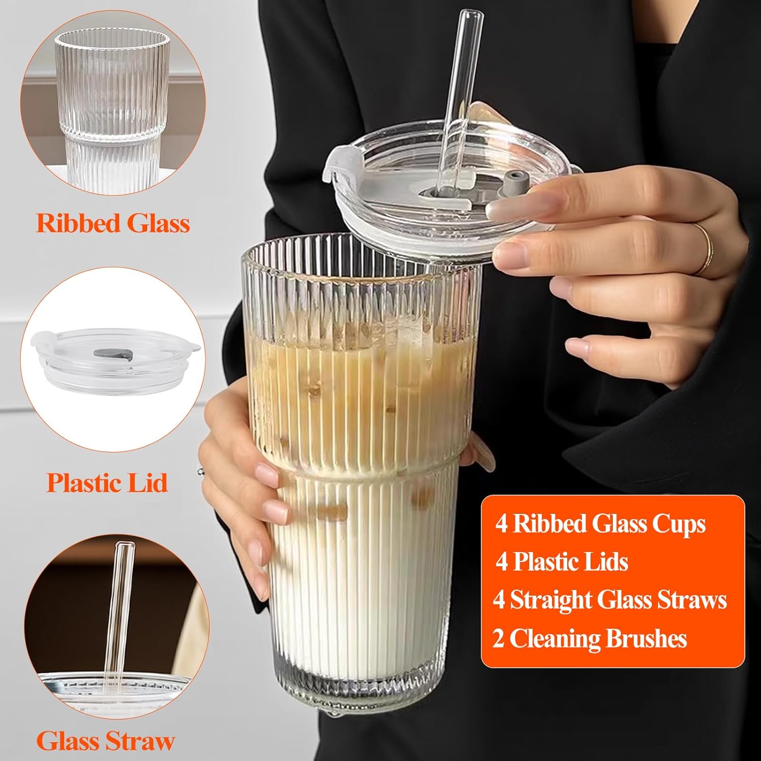 - Complete Glass Tumbler Set: Each kit comes with 4 ribbed glass cups, 4 matching plastic lids, 4 glass straws, and 2 straw cleaning brushes. Whether at home or on the go, this complete glass tumbler set from us will give you everything you need for a quality drinking experience