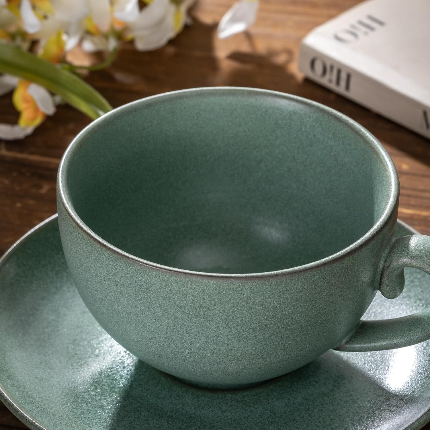Cup and Saucer Set Turquoise Ceramic Cappuccino Mug Set of 1-10 oz Microwave and Dishwasher Safe, Perfect For Tea, Espresso, Latte - Porcelain Mugs for Kitchen or Cafe
