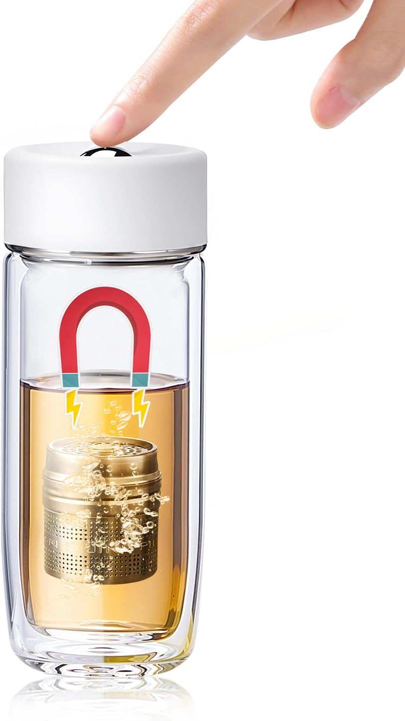 MagnaDrop Tea Tumbler – Double Wall Glass Tea Infuser Cup with Magnetic Steep Control & Bead Switch, Leakproof Travel Mug for Loose Leaf, 10.5oz