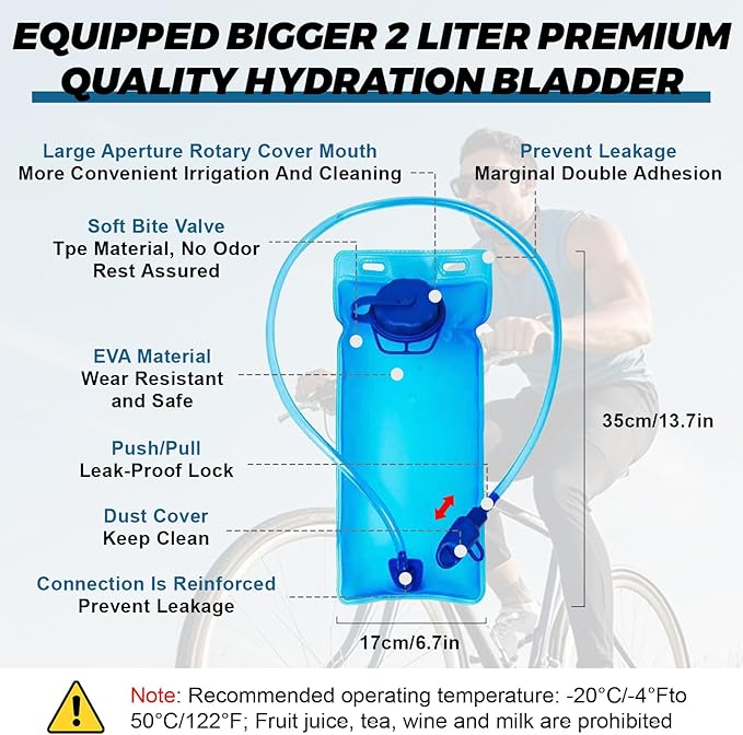 - 💦【Quality water bag configuration】 Hazxh running vest equipped with 2*2L food grade water bag, water filling is easy and convenient, water pipe is easy to clean. Steady output of healthy water flow (40 inches /100 cm long, 0.4 inches /1 cm diameter), carefree drinking, suitable for -20 ~+50°C water temperature, to meet a variety of outdoor drinking needs.