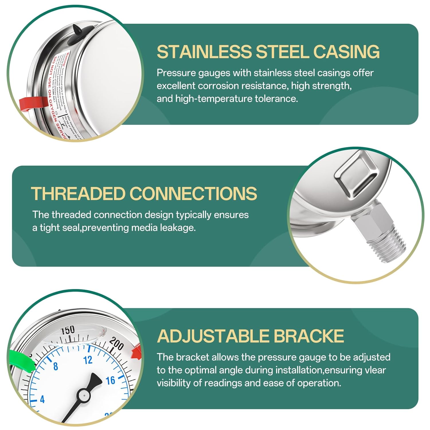 0-300PSI Stainless Steel Liquid Filled Pressure Gauge, 2.5" Dial Size, 1/4" NPT 316 Stainless Steel Joint, Lower Mount, for Tube, Water Pump, Gas, Liquid (with Range Mark Pointer)
