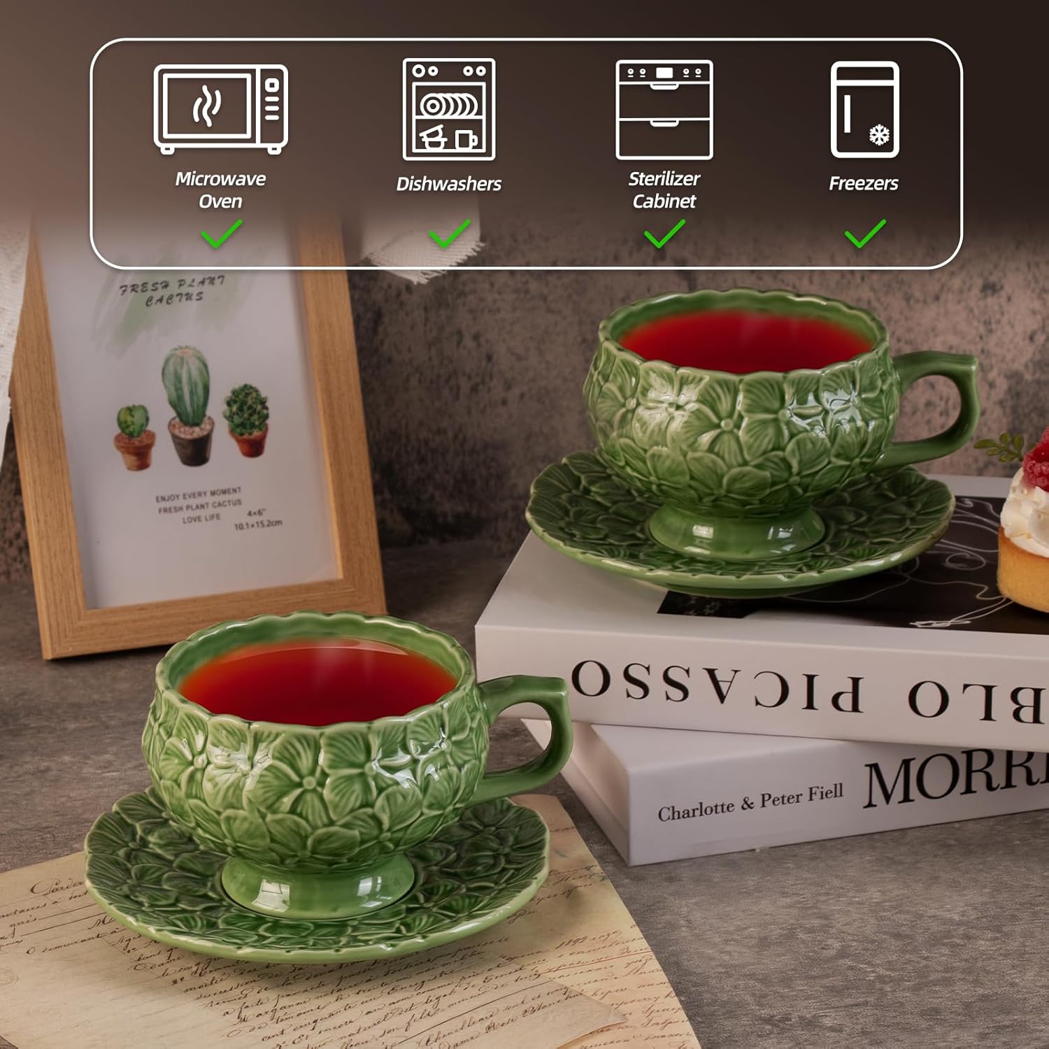 KAMMAK Tea Cups and Saucers Set of 2, Porcelain Coffee Cups, 8.5-Ounce Stackable Espresso Mugs, Ceramic Demitasse for Coffee, Latte, Americano, Tea, Green Flower