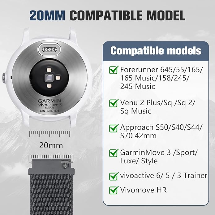 - 20MM COMPATIBLE MODELS: Fit for all traditional watch and smart watch with 20mm width watch lugs. 20mm compatible for Garmin Forerunner 645/ 55/165 /165 Music/ 158/ 245/ 245M Music, Venu 2 Plus/Venu Sq/Sq2/Sq Music, Approach S50/S40/S44/S70 42mm, GarminMove 3/Sport/Luxe/Style, Vivoactive 6/ Vivoactive 5/ 3 trainer/ Vivomove HR