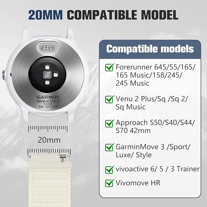 • 20MM COMPATIBLE MODELS: Fit for all traditional watch and smart watch with 20mm width watch lugs. 20mm compatible for Garmin Forerunner 645/ 55/165 /165 Music/ 158/ 245/ 245M Music, Venu 2 Plus/Venu Sq/Sq2/Sq Music, Approach S50/S40/S44/S70 42mm, GarminMove 3/Sport/Luxe/Style, Vivoactive 6/ Vivoactive 5/ 3 trainer/ Vivomove HR