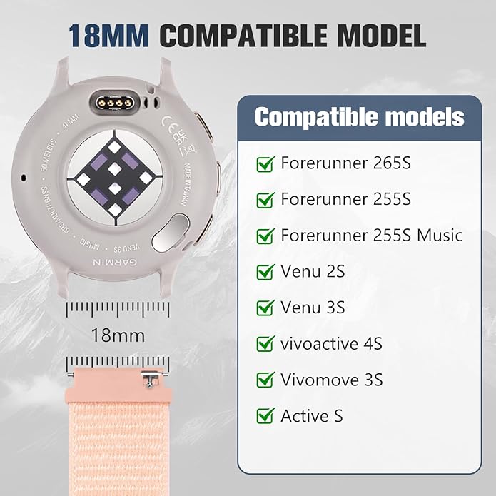 - 18MM COMPATIBLE MODELS: Fit for all traditional watch and smart watch with 18mm width watch lugs. Compatible for Garmin Venu 3S/Venu 2S/Vivoactive 4S/Vivomove 3S/Active S, Forerunner 255S/Forerunner 255S Music/Forerunner 265S