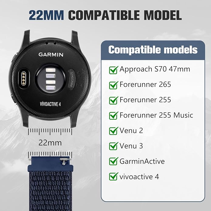 • 22MM COMPATIBLE MODELS: Fit for all traditional watch and smart watch with 22mm width watch lugs. 22mm for Garmin Forerunner 265/ 255/ 255 music, Venu 2/ Venu 3, Approach S70 47mm, GarminActive, Vivoactive 4