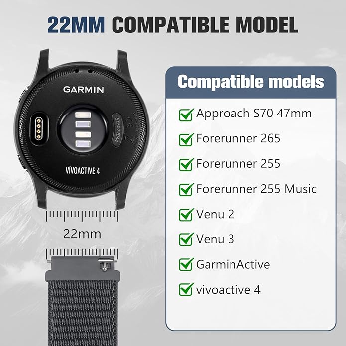 - 22MM COMPATIBLE MODELS: Fit for all traditional watch and smart watch with 22mm width watch lugs. 22mm for Garmin Forerunner 265/ 255/ 255 music, Venu 2/ Venu 3, Approach S70 47mm, GarminActive, Vivoactive 4