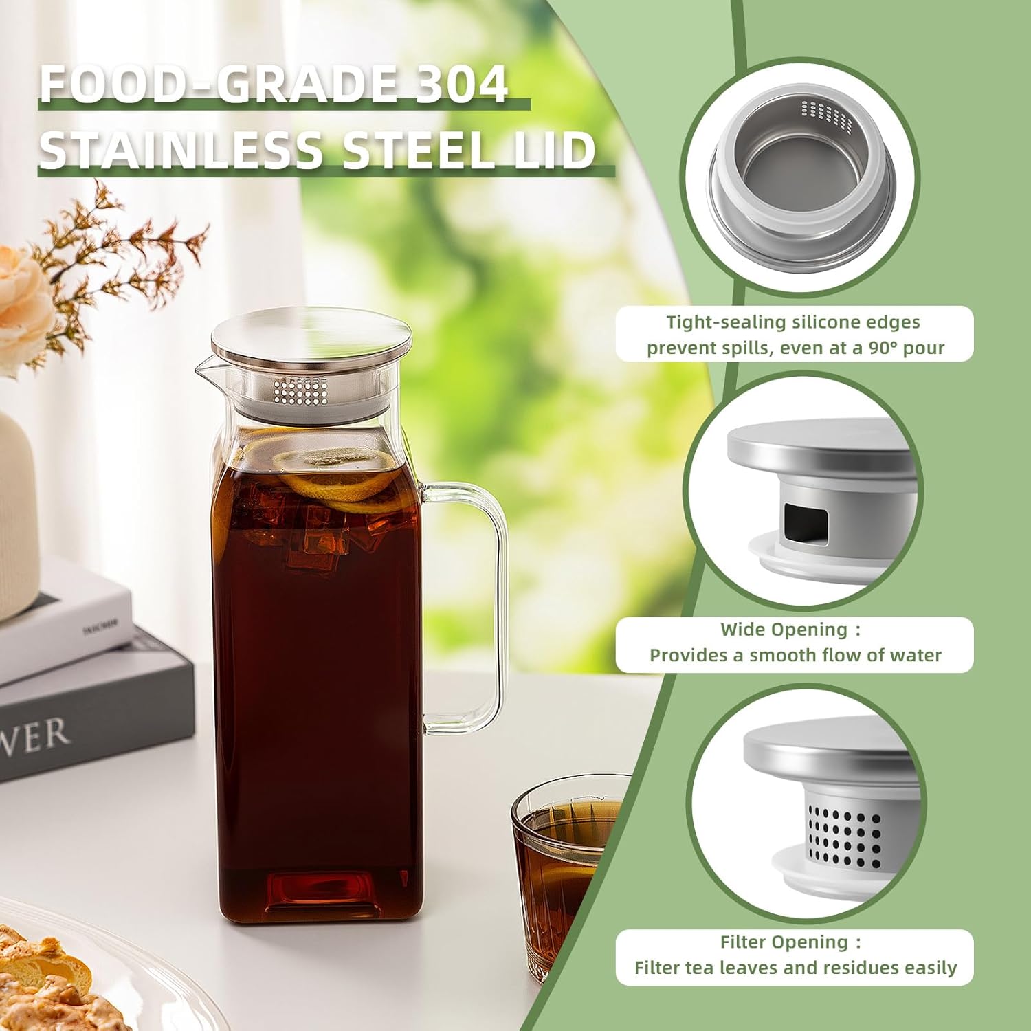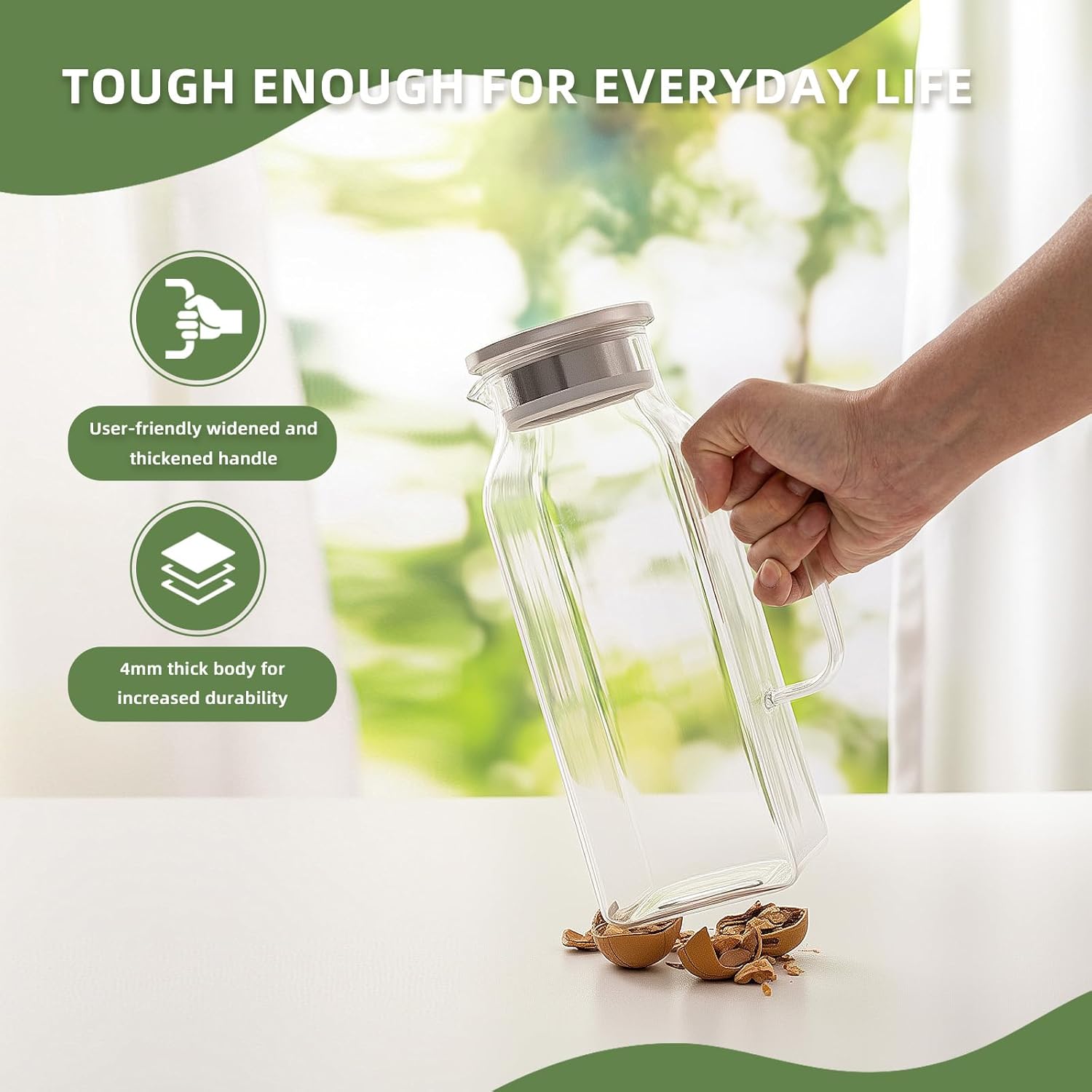 - [Safe and Sturdy Glass Material]: Our pitcher is crafted from premium high-grade borosilicate glass, ensuring it's 100% free of lead, heavy metals, and toxins. With a sturdy 4mm thickness, our pitchers are built to last, ensuring enduring durability.