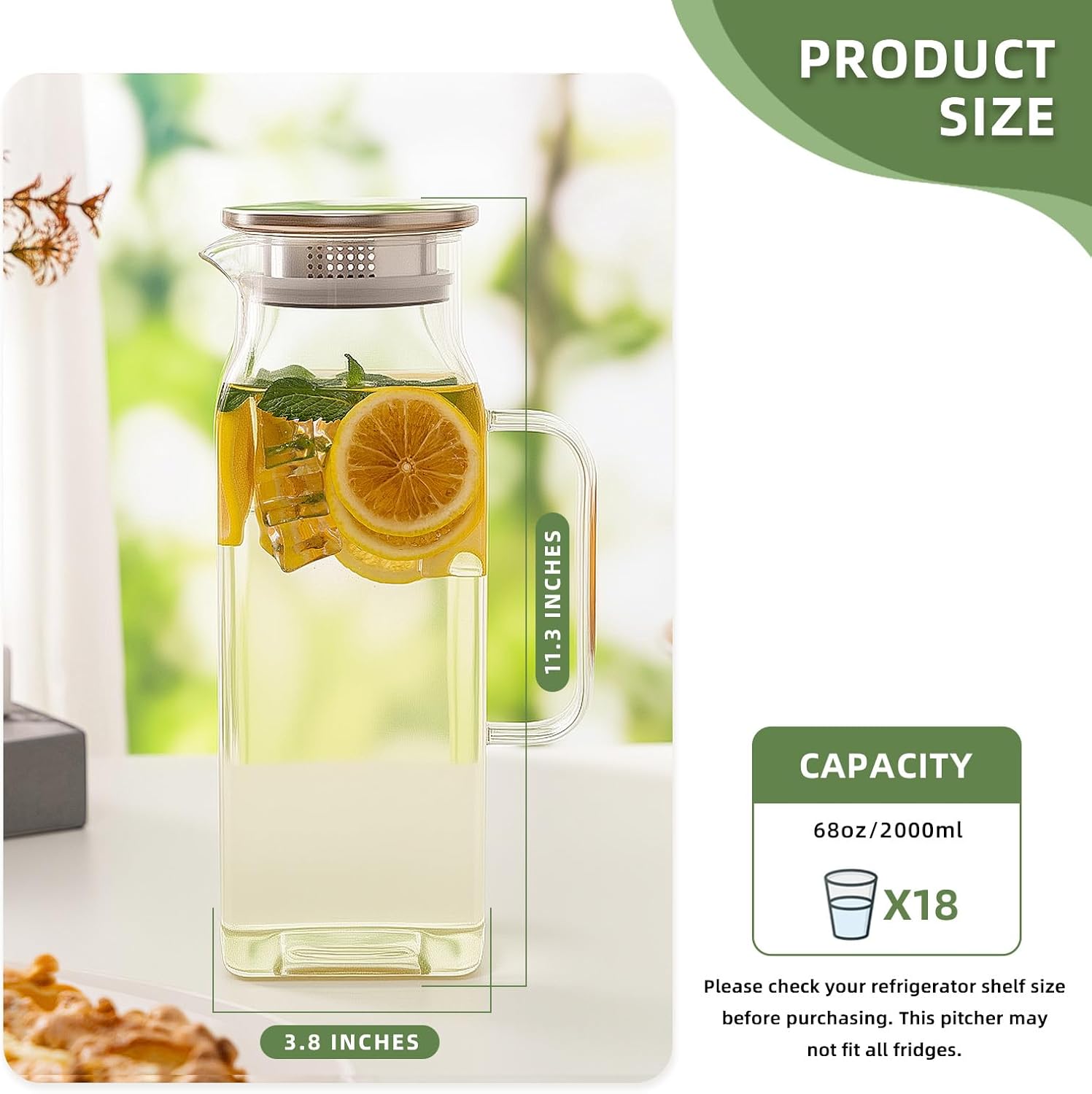 - [2000ML Capacity]: With a 68oz capacity, our pitcher is perfect for restaurants, parties or daily use. It can hold water, milk, coffee, fresh juice, wine or any other beverage. [Note]: Please check your refrigerator shelf size before purchasing. This pitcher may not fit all fridges.