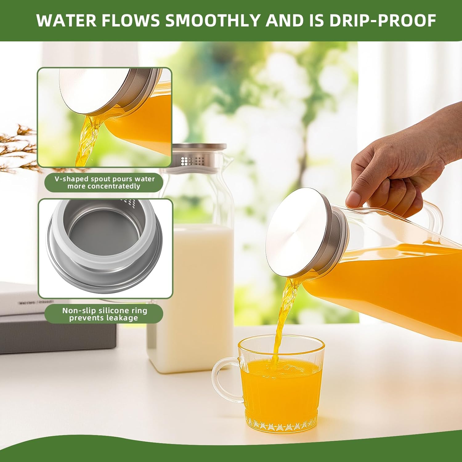 - [Anti-drip Spout & Reinforced Handle]: With its V-shaped spout, this pitcher is designed to minimize spills during pouring. The enhanced ergonomic handle, thicker and wider, ensures easier and more comfortable pouring.