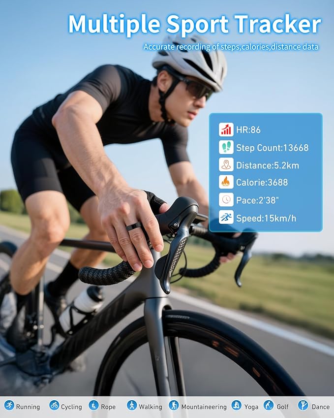 - ✨【Multiple Activity Tracker 】The fitness rings tracker for men women automatically track your daily steps, calories and distance throughout the day, while you do sports. This smart ring has multiple sports modes such as running, cycling, ropeskinpping, walking, mountaineering, yoga, ,golf, dancing. You will get sport route, time, steps, heart rate, calories, pace, speed and distance from the App, which can provide you with more effective exercise referrence.