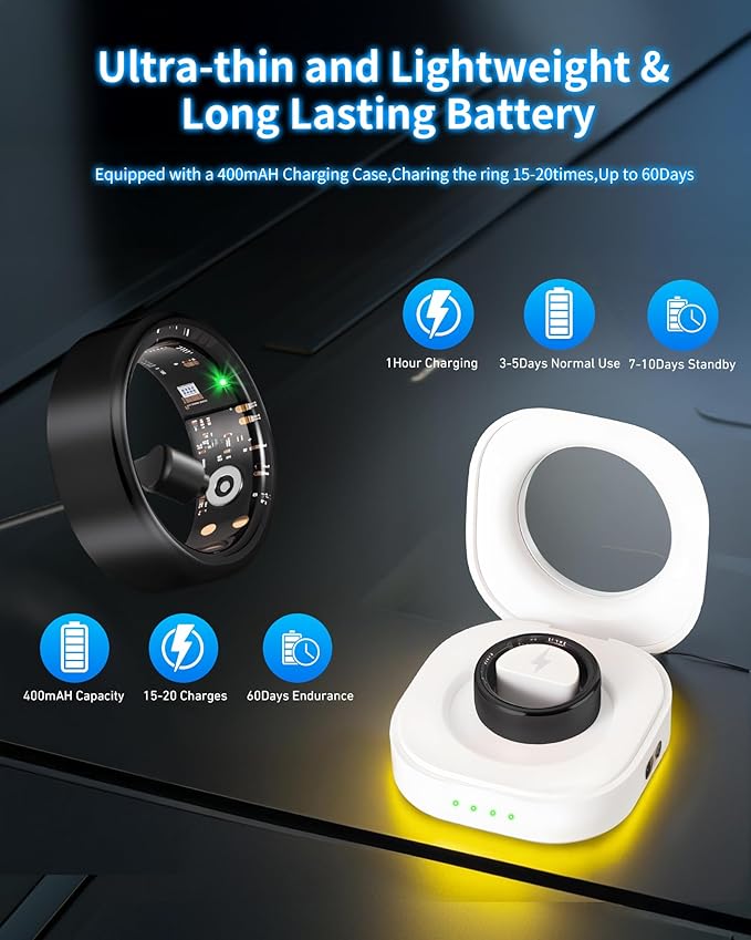 • 🔔【Fast Charging and Long Battery Life】 This ring health tracker comes with a surprising battery, with a battery capacity of 20mAh and a battery life of 3-7 days on a 1 hour charge. It equided with a portable 400 mAh charging case that provides multiple charges, and you can charge the charging case and let it recharge your smart ring health tracker again. Even if you are on business trips, on-road tours, or outdoor activities, you can ensure continuous health monitoring no matter where you are.
