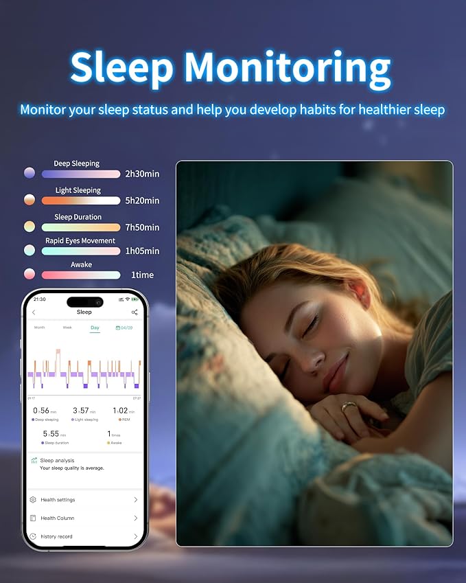- 💡【Health Sleep Tracker】: This sleep smart ring tracks your sleep by monitoring your falling asleep, wake time, and sleep duration (deep and light sleep). You can view daily, weekly and monthly sleep data in the app to help you adjust your habits and improve your sleep quality.