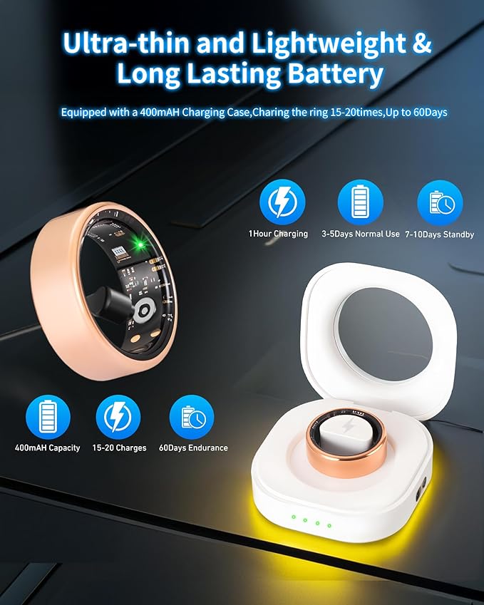 - 🔔【Fast Charging and Long Battery Life】 This ring health tracker comes with a surprising battery, with a battery capacity of 20mAh and a battery life of 3-7 days on a 1 hour charge. It equided with a portable 400 mAh charging case that provides multiple charges, and you can charge the charging case and let it recharge your smart ring health tracker again. Even if you are on business trips, on-road tours, or outdoor activities, you can ensure continuous health monitoring no matter where you are.