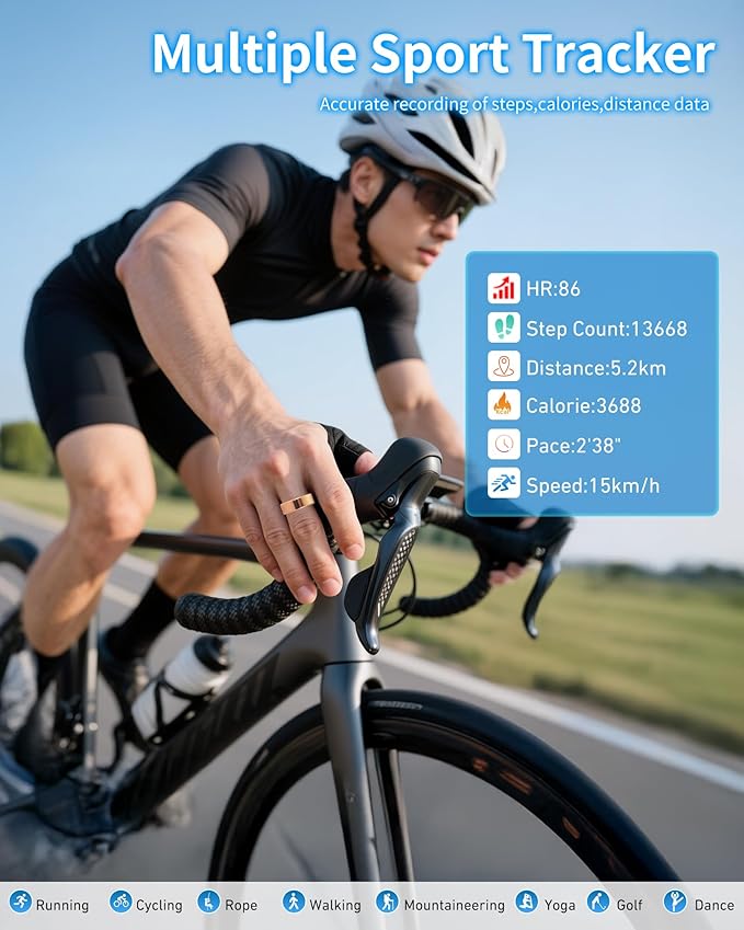 - ✨【Multiple Activity Tracker 】The fitness rings tracker for men women automatically track your daily steps, calories and distance throughout the day, while you do sports. This smart ring has multiple sports modes such as running, cycling, ropeskinpping, walking, mountaineering, yoga, ,golf, dancing. You will get sport route, time, steps, heart rate, calories, pace, speed and distance from the App, which can provide you with more effective exercise referrence.