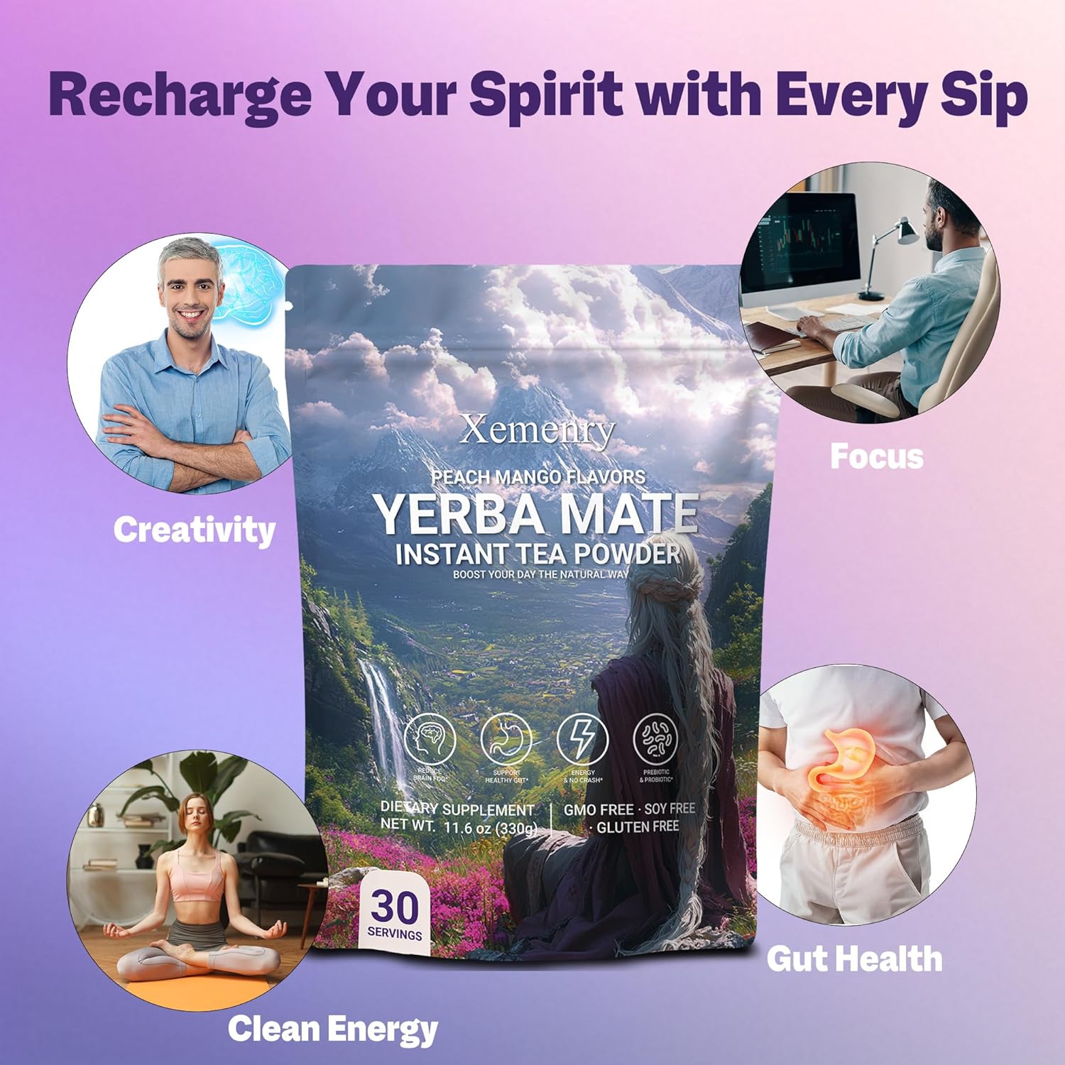 Yerba Mate Tea Powder - Peach Mango, Clean Energy & Focus with L-Theanine, Gut Health Support with Prebiotics, No Crash, 11.6oz (30 Servings)