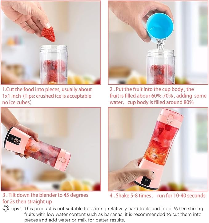 - 【Perfect Gift】This portable blender is not only very beautiful, but also very practical, capable of making various juices and milkshakes. This is also a perfect gift for friends or family, they will definitely love it.💜💜💜Tips:This product is not suitable for stirring relatively hard fruits and food. When stirring fruits with low water content such as bananas, it is recommended to cut them into pieces and add water or milk for better results
