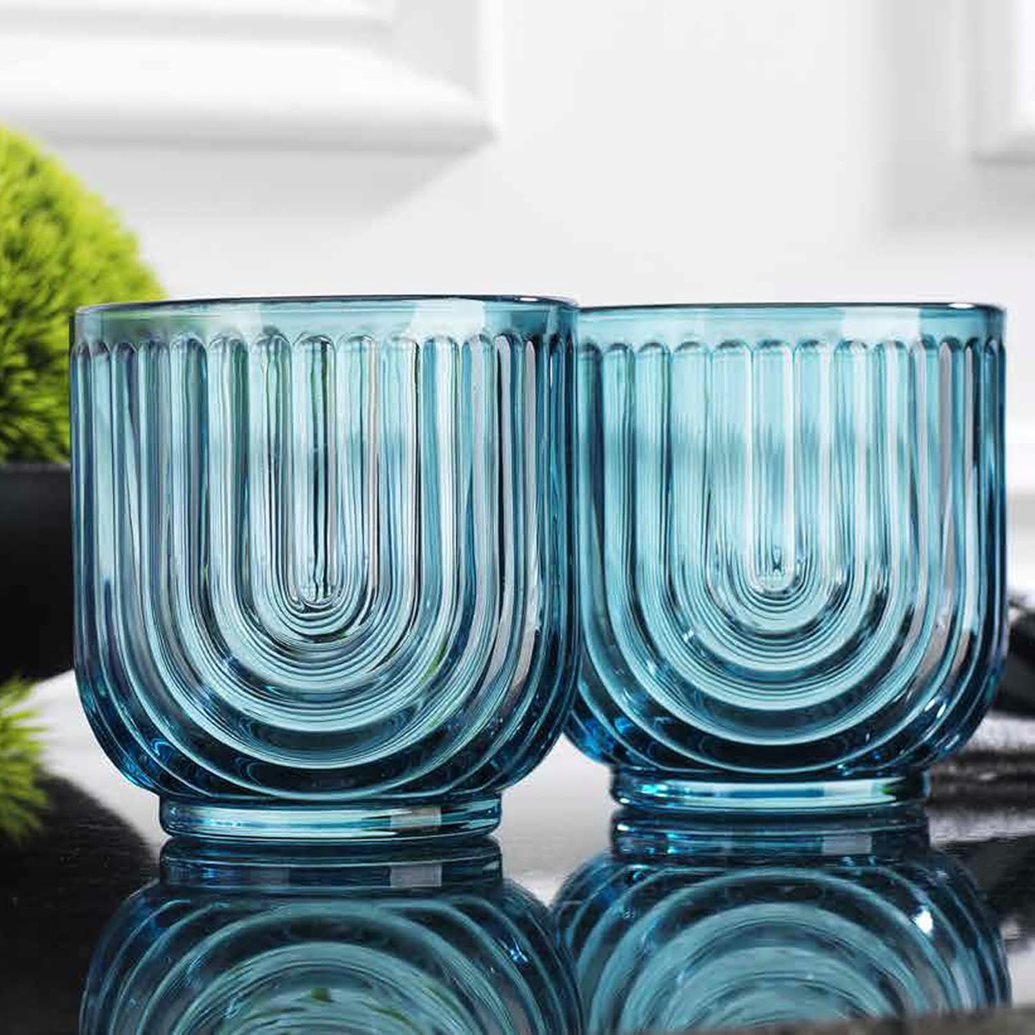 - 💪HIGH QUALITY: 4 matching blue drinking glasses, each with an 11-ounce capacity (325 ml), Glasses are designed with rippled thick glass, super sturdy, and well-weighted. Not too heavy, nor too light. Fancy, yet basic set. Our Glasses are BPA-free and lead-free. Just make sure to handwash this colored glassware in order to preserve its precious color.