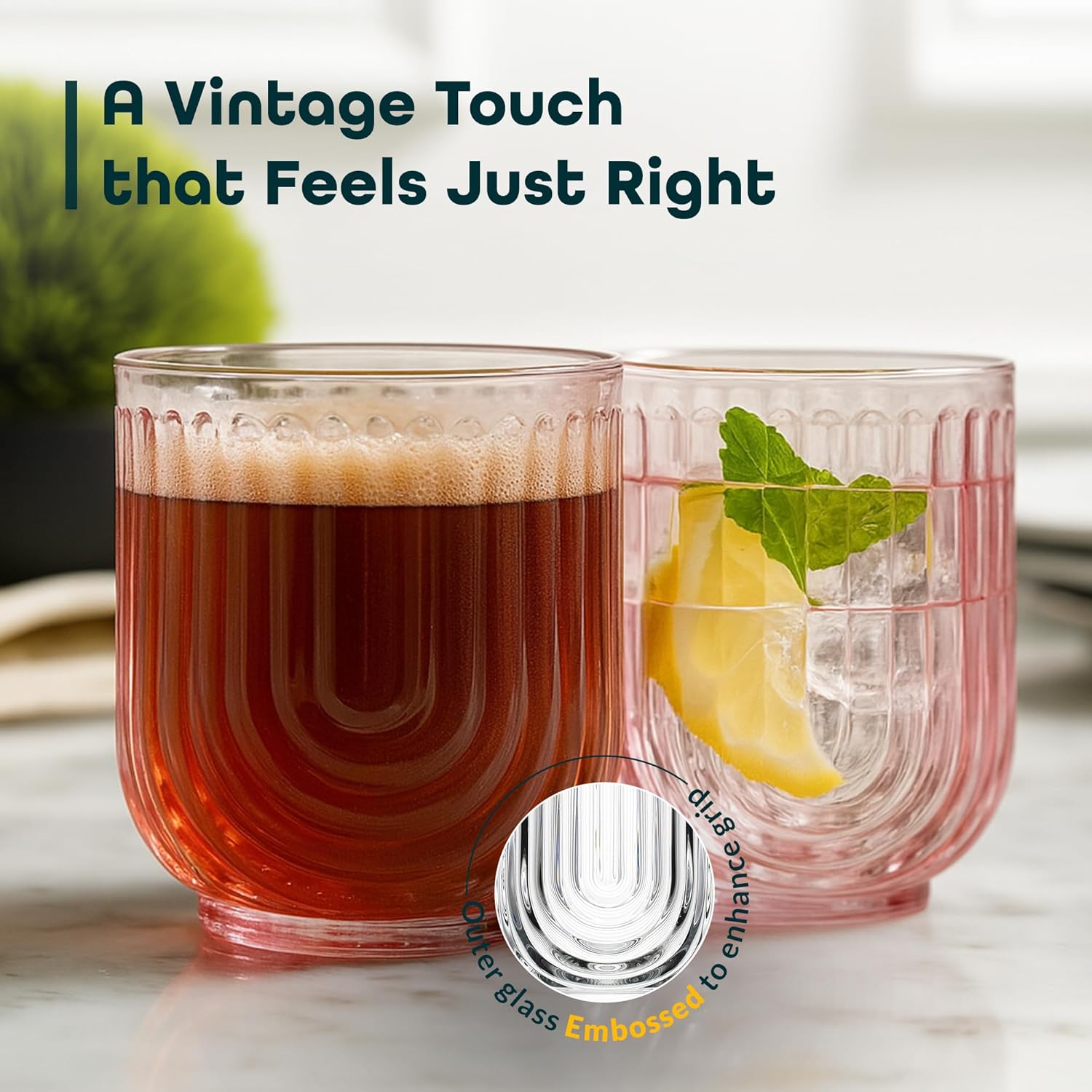 - 💖ELEGANT DESIGN: Art Deco U-shaped pattern in pink glass creates a stunning vintage-inspired look perfect for any home bar or dining setting. These blush pink double old-fashioned whiskey glasses are perfect for a variety of alcohol beverages including spirits neat or on the rocks, cocktails, bourbon, scotch or any other soft cold drink like water and juice.