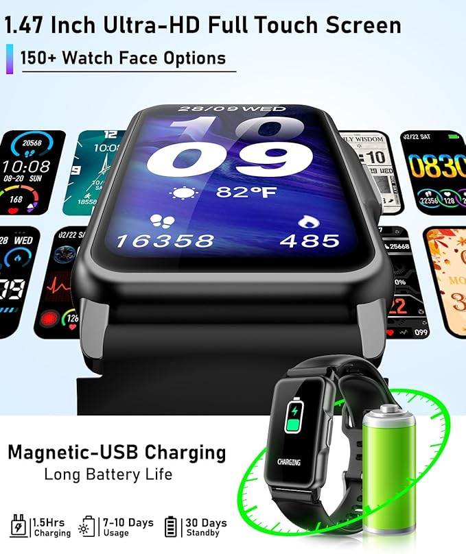 - 【Superb Visual and Operational Experience】The unique curved 1.47-inch ultra-HD full touch screen of this fitness tracker offers you superb visual and operational experience. Immerse yourself in crystal-clear visuals, providing an intuitive and responsive interface that keeps you in control of your fitness metrics and settings. Express your unique style every day with over 150 watch faces in the App or your favorite photo in your phone album, keep your wrist as dynamic as your lifestyle.