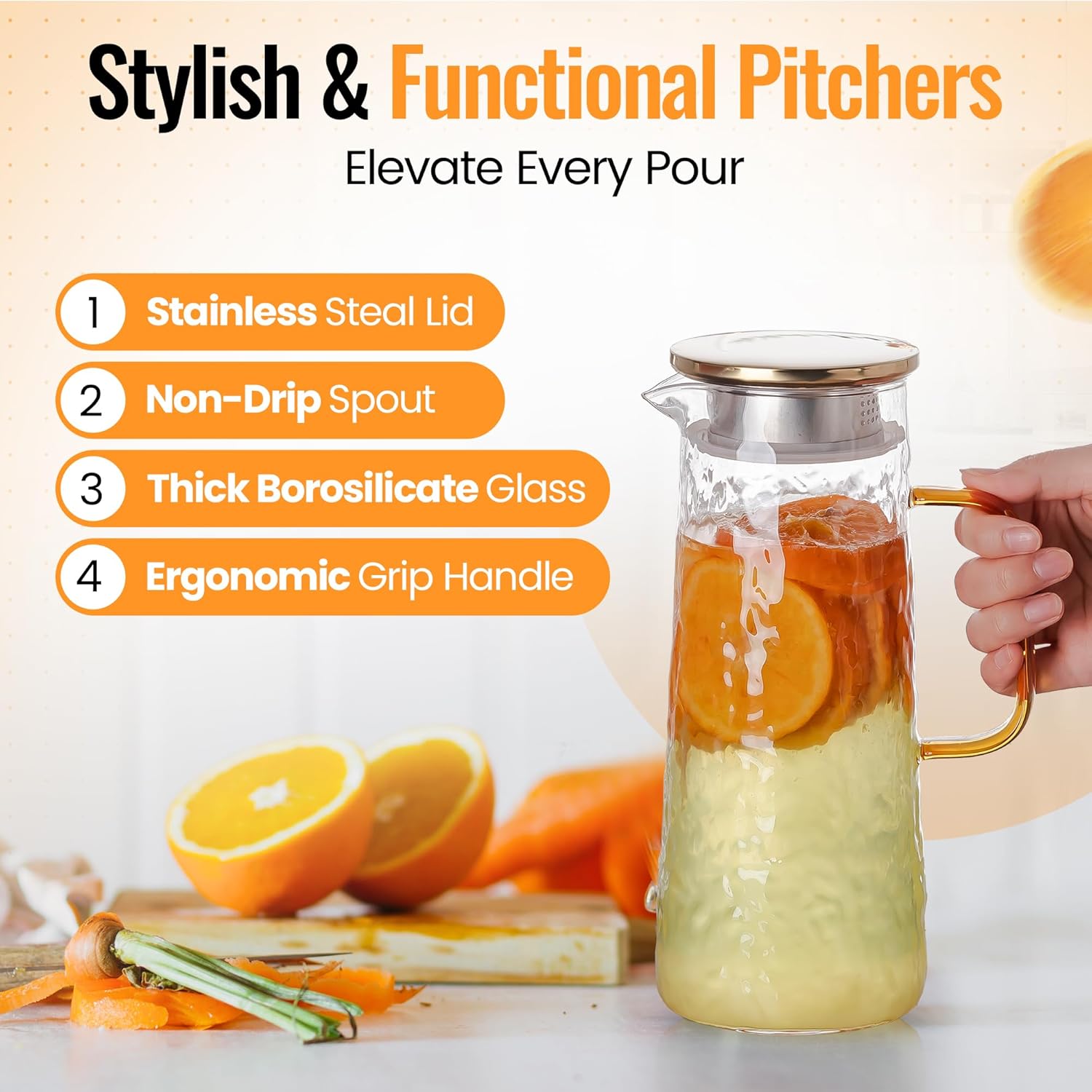 - DURABLE CONSTRUCTION: Made from thick borosilicate glass with heat-resistant properties, these pitchers can safely handle both hot and cold beverages