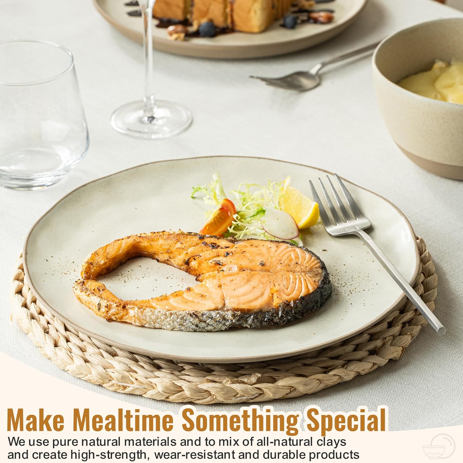 - HEALTHY & SAFETY:These dinnerware set are made of premium clay making it free of lead and cadmium,The plates and bowls in this set are crafted from biodegradable materials with Recyclable material at Least 10% and adorned with an all-natural glaze