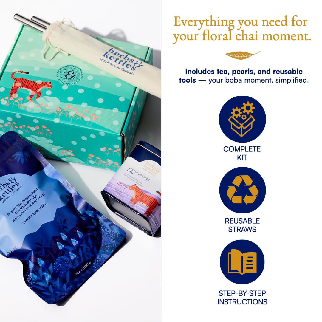 Herbs & Kettles Vanilla Lavender Chai Boba Kit | Assam Black Tea with Real Vanilla Bean, Lavender Flowers & Warming Spices + Chewy Tapioca Pearls | DIY Bubble Tea Kit with Reusable Straws