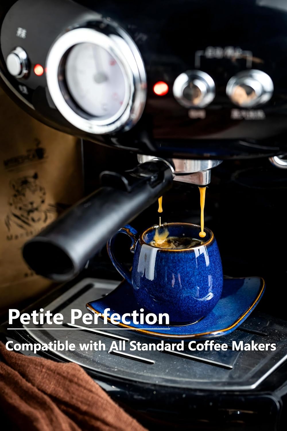- Vibrant 3oz Espresso Set with All the Extras: Comes with 6 ceramic cobalt blue espresso cups (3oz), matching square saucers, 6 spoons, and a sleek metal stand. Perfect for espresso shots, double espressos, or tiny mochas—adds a pop of color to your coffee routine