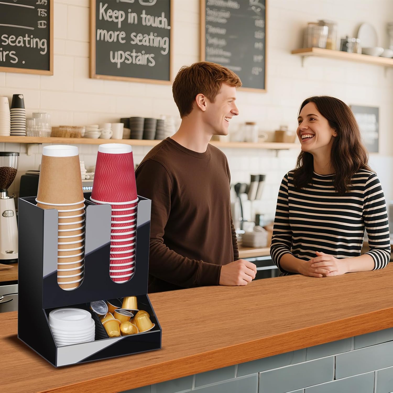 - MULTI-COMPARTMENT DESIGN: This coffee station accessories has spacious compartments that can accommodate cups/cup lids with a diameter of less than 3.9 inches (10 cm). There is enough space to easily accommodate a large number of paper cups, spoons, syrup packets, and Coffee Pods. Cup dispenser is clearly classified and easy to take and put, which greatly improves your use efficiency and meets the daily needs of different places such as home, office, restaurant, etc.