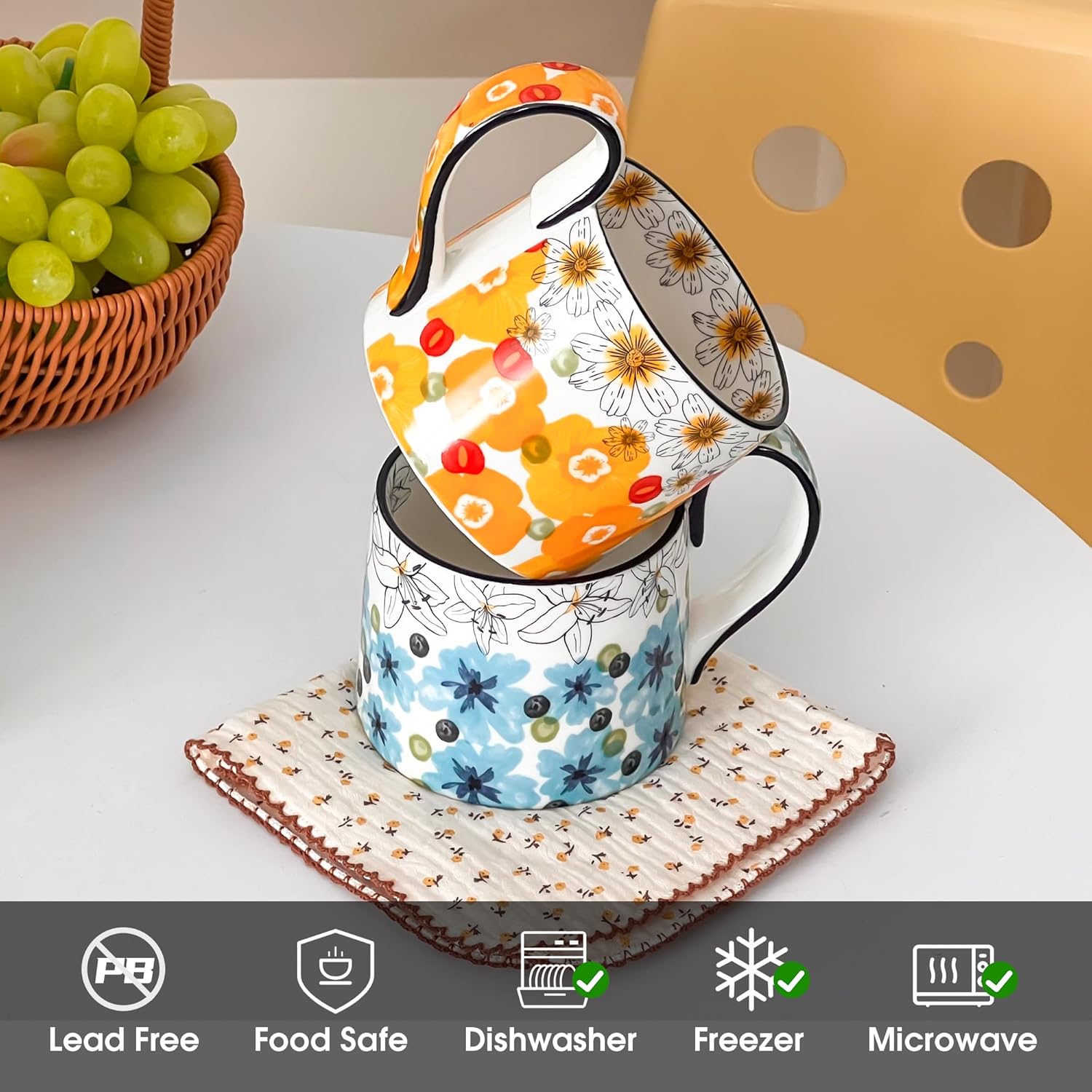 Ceramic Coffee Mug, 12oz Cute Floral Coffee Mugs with Large Handle, Orange Flower Design Stoneware Tea Cup for Office and Home