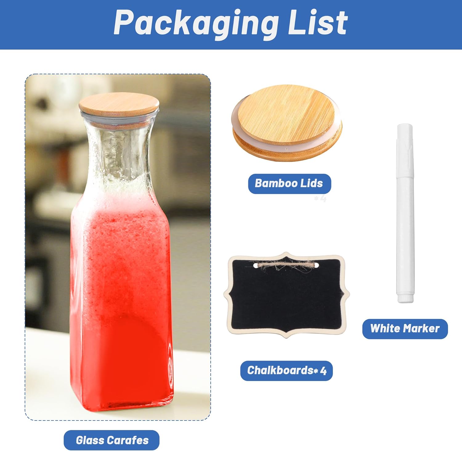 35 Oz Square Glass Carafe with Bamboo Lid, Beverage Dispensers,Mimosa Bar Supplies,Clear Glass Pitcher with Name Labels for Iced Tea,Coffee,Juice(Pack of 4)