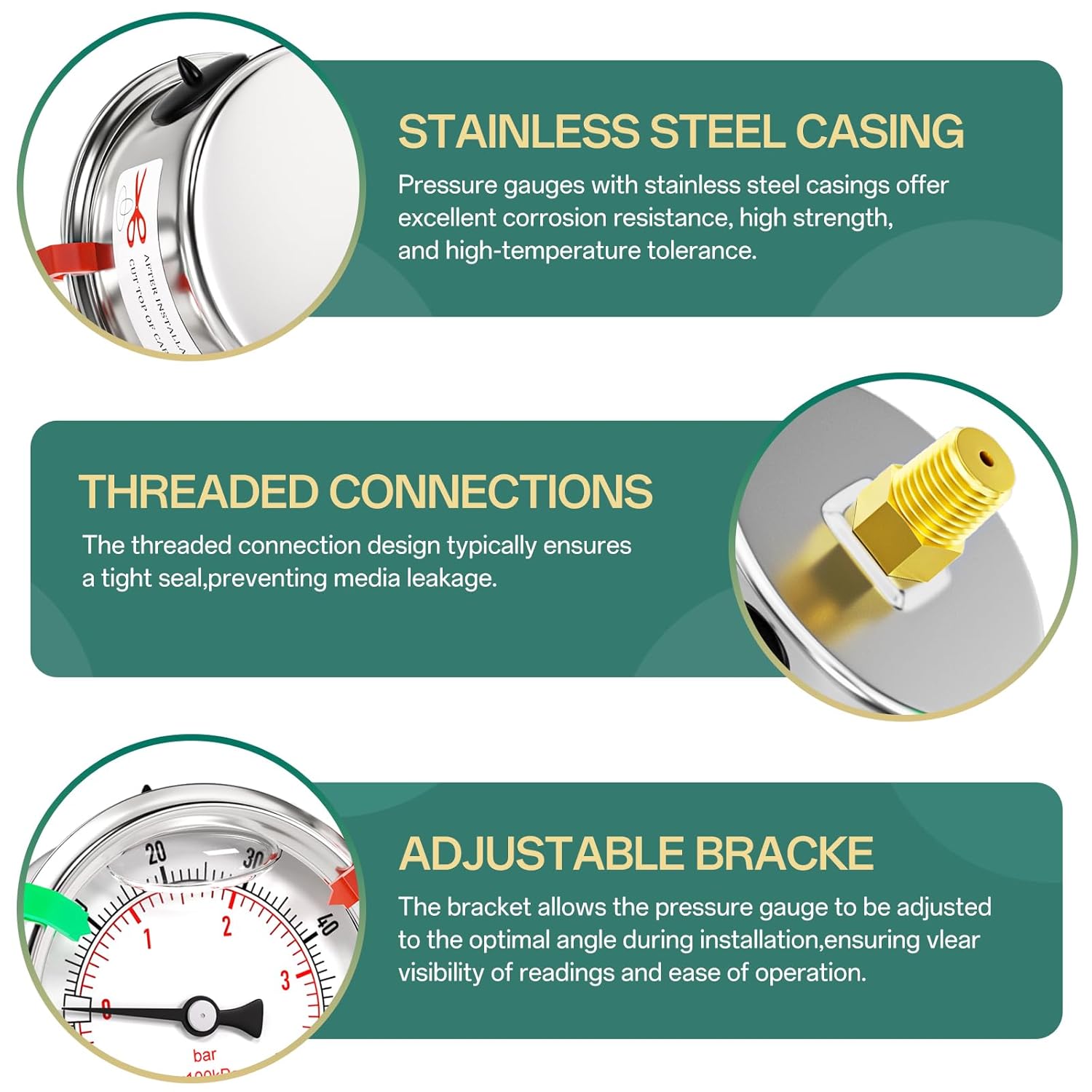 - [MATERIAL FEATURES] 304 stainless steel housing, corrosion-resistant, glycerin filled for stable readings and to avoid vibration damage.