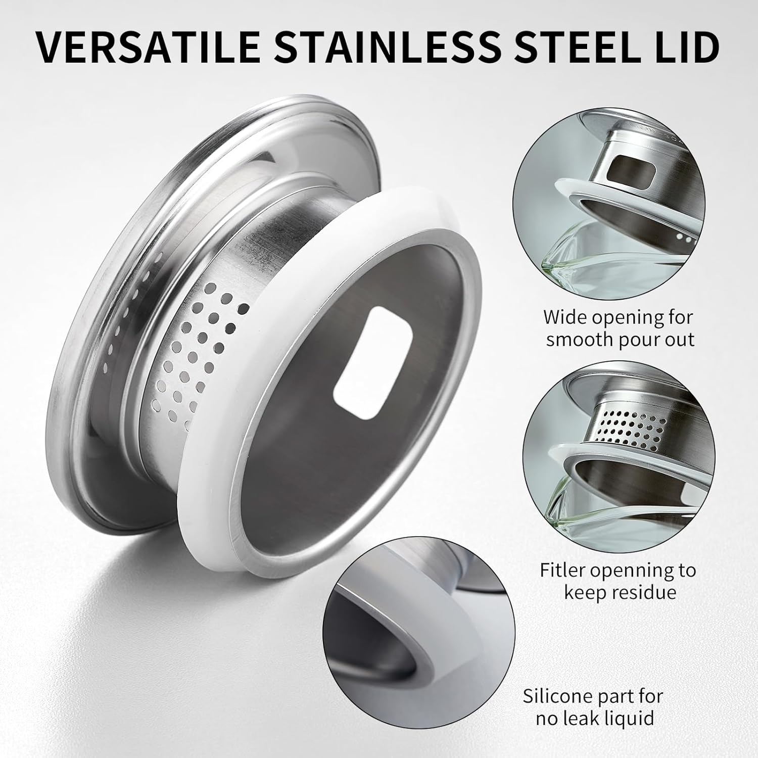 - High Borosilicate Glass: The water pitcher is made of heat resistant Borosilicate glass and can Two Different Pour Functions: The iced tea pitcher comes with premium 304 stainless steel lid that has 2 different pour functions, one with tiny holes to act like a strainer to keep ice or fruits inside pitcher when pouring and 180 degree turn of the cap provides a “wider” mouth. The lid also has a silicone ring that improves sealing performance and reduces leaks or spills.