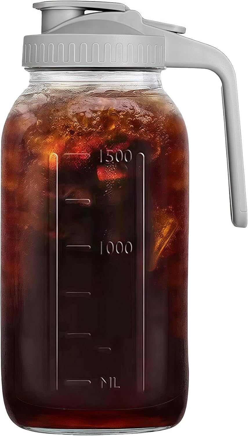 64oz Glass Pitcher with Handle and Lid, 2 Quart Mason Jar Pitcher - Airtight & Leakproof Water Jug with Pour Spout Lid, Glass Containers for Fridge, Perfect for Juice, Cold Brew, Iced & Sun Tea