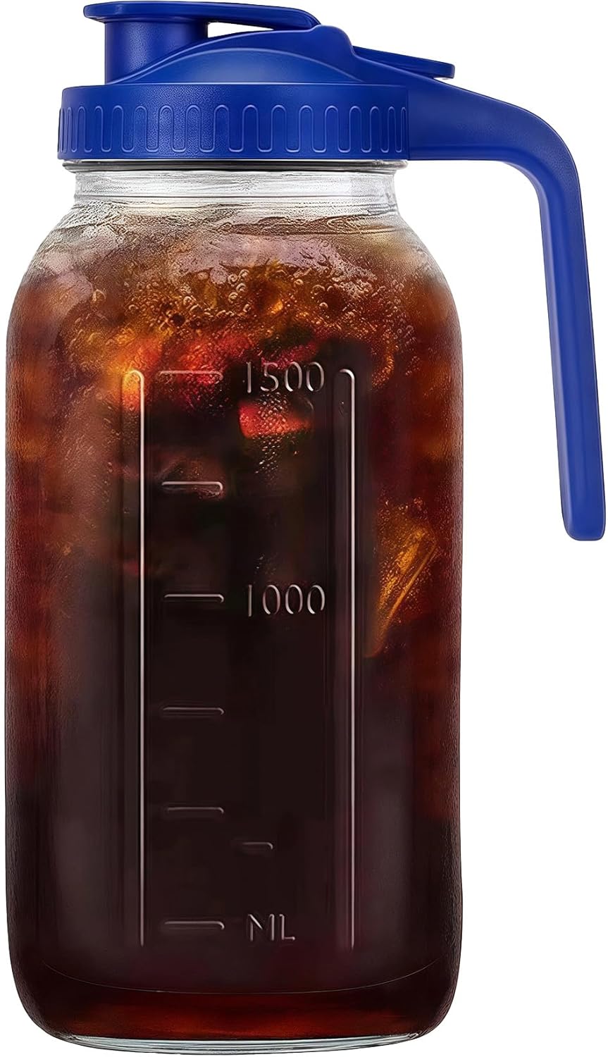 64oz Glass Pitcher with Handle and Lid, 2 Quart Mason Jar Pitcher - Airtight & Leakproof Water Jug with Pour Spout Lid, Glass Containers for Fridge, Perfect for Juice, Cold Brew, Iced & Sun Tea