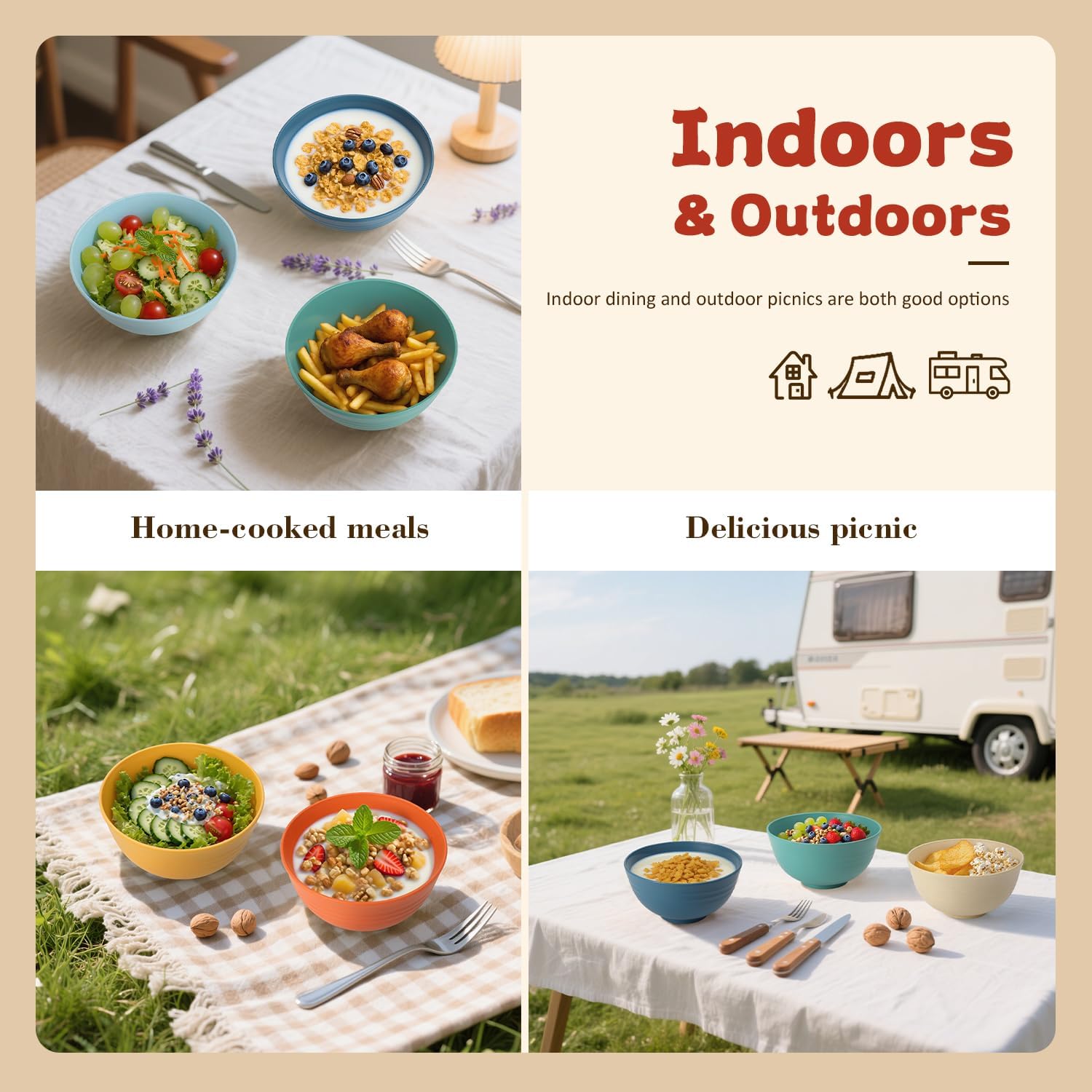 - 【𝗜𝗻𝗱𝗼𝗼𝗿𝘀 & 𝗢𝘂𝘁𝗱𝗼𝗼𝗿𝘀 𝗨𝘀𝗶𝗻𝗴】- These bowls are lightweight and unbreakable,featuring a smooth surface that makes cleaning effortless.Ideal portable bowls sets for camping,picnic,RV trips, and outdoor adventures.