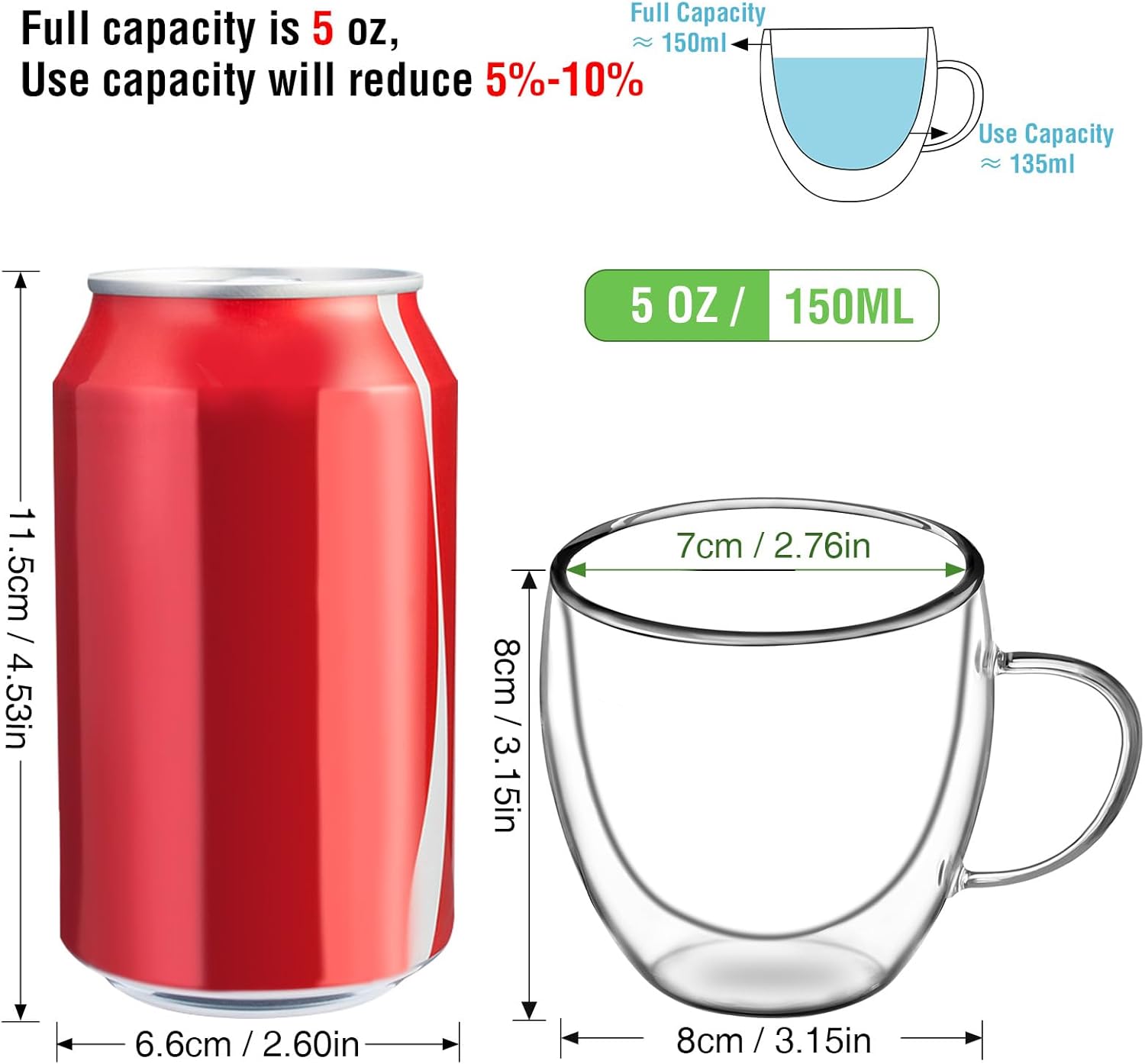 - DOUBLE WALL GLASS COFFEE MUGS- Double Wall of the espresso shot cups ensures your safety when touching cold or hot drinks, also makes it an insulated espresso cup to keep the temperature of drinks for longer time. Transparent design of the glass espresso coffee mugs adds more elegance and joy to drink.