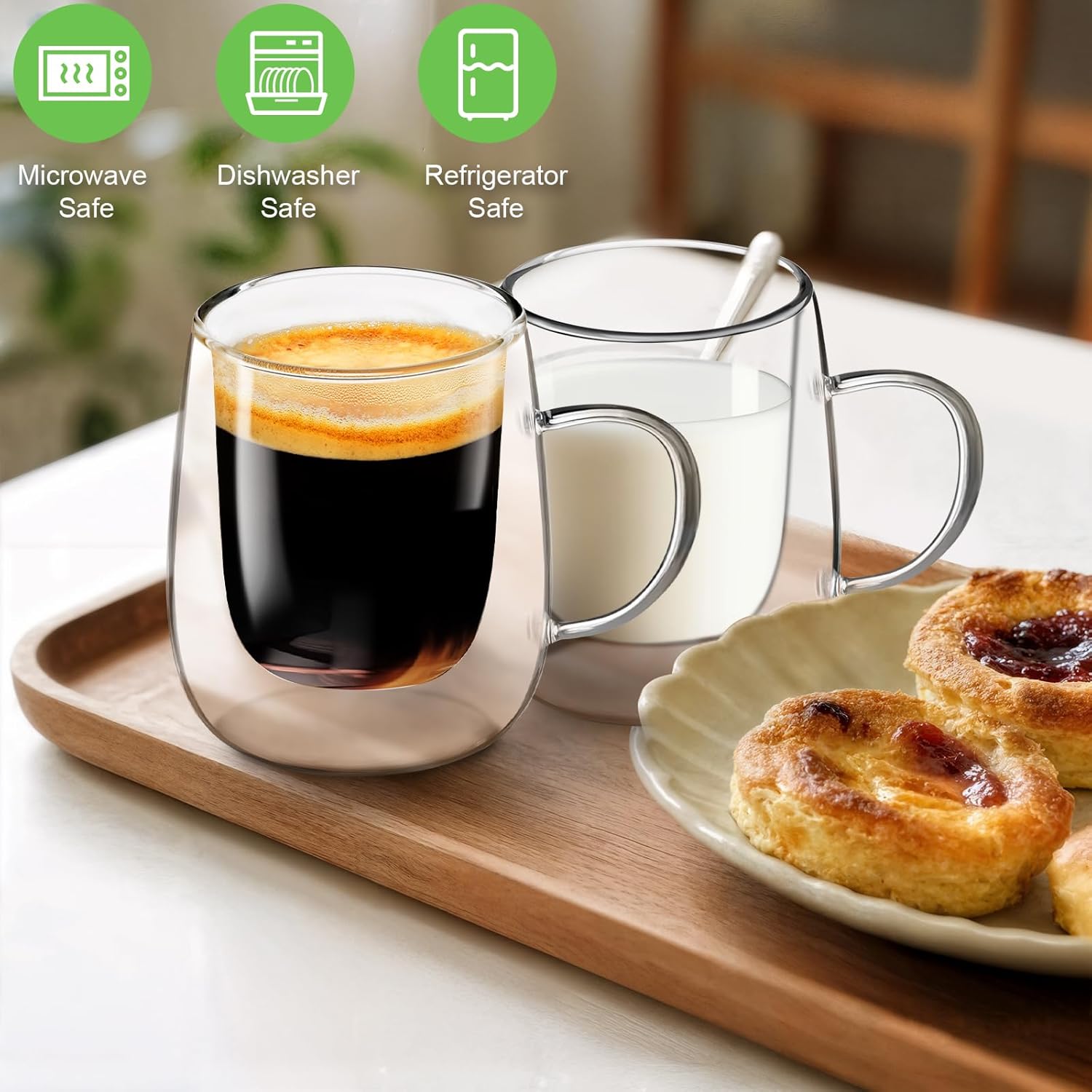 - DOUBLE WALLED GLASS COFFEE MUGS- Double Wall of the glass coffee cups ensures your safety when touching cold or hot drinks, also makes it an insulated coffee mug to keep the temperature of drinks for longer time. Transparent design of the glass cups adds more elegance and joy to drink.