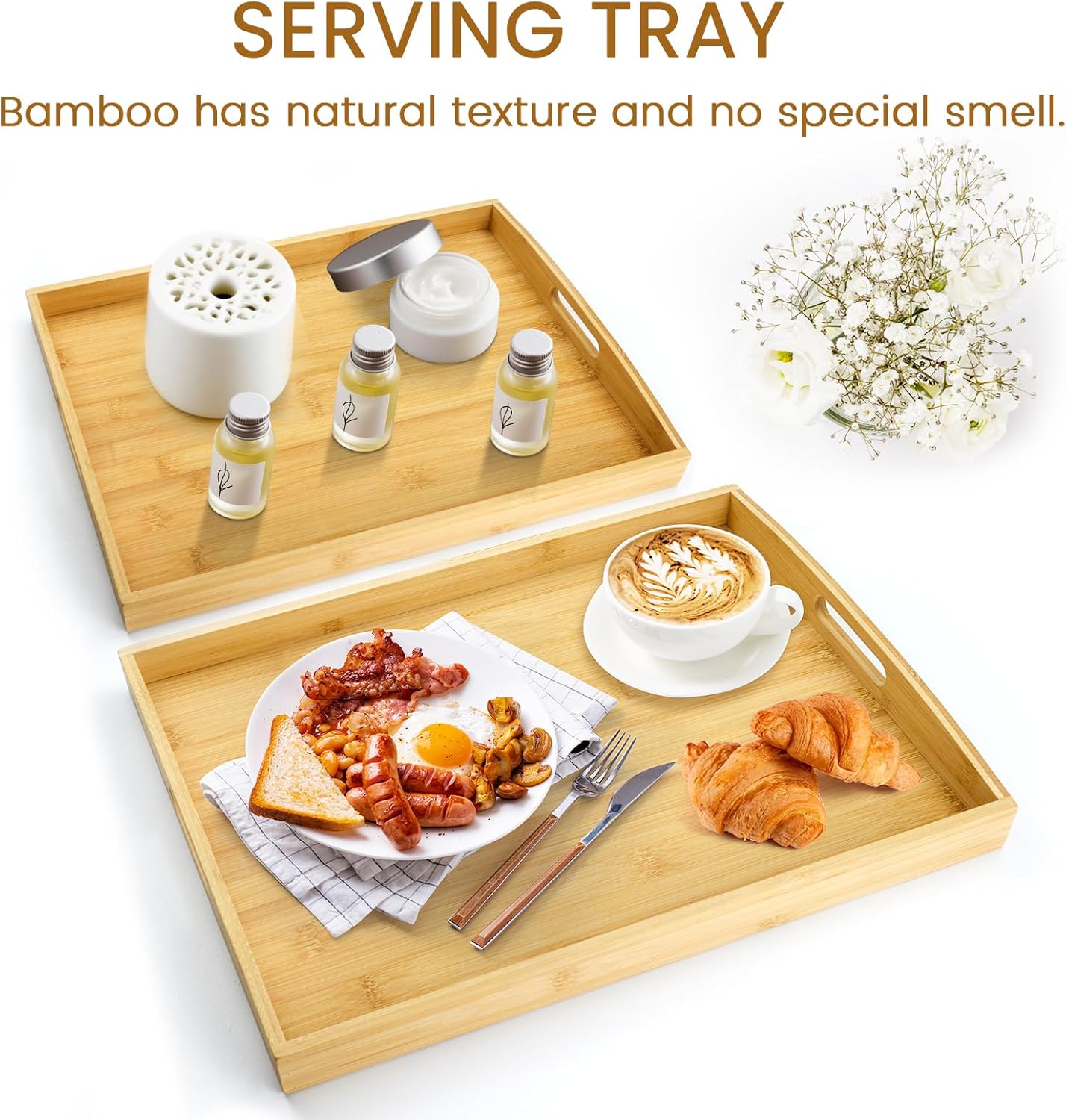 - Decorative Serving Tray : The bamboo tray is more than just for food, use for storage or as a decorative tray. Perfect for breakfast in bed, organizing essentials on your coffee table, kitchen, sofa, or bathroom.The smooth surface is easy to clean with a damp cloth