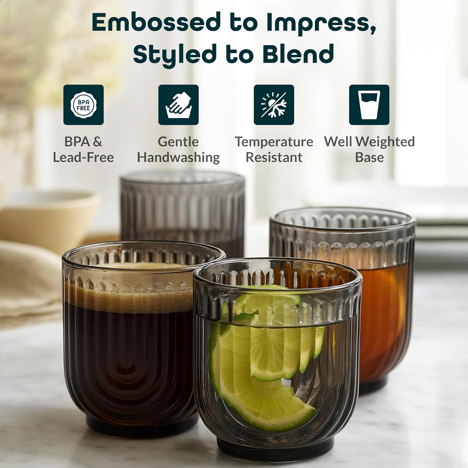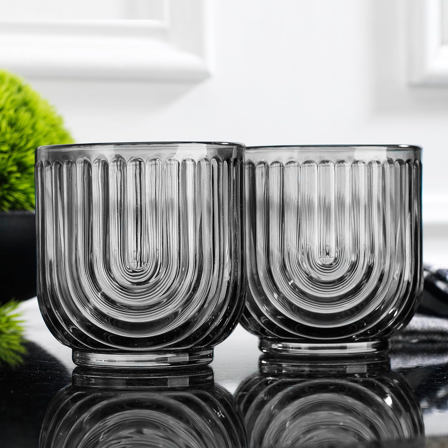 Glaver's Double Old Fashioned Rock Glasses, Set of 4 Smoke Black Whiskey Glasses, 11 oz Art Deco U-Shape Design Embossed Everyday Home Bar Glassware. Art Deco Elegant Kitchen Drinking Glasses.