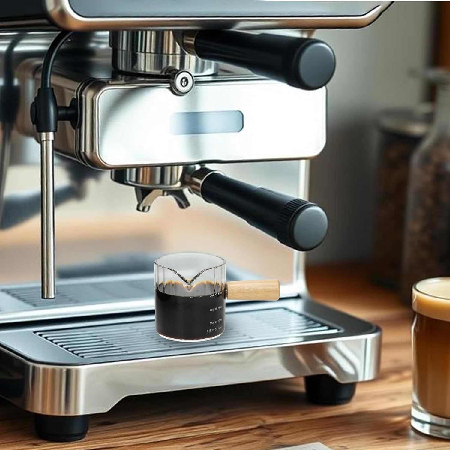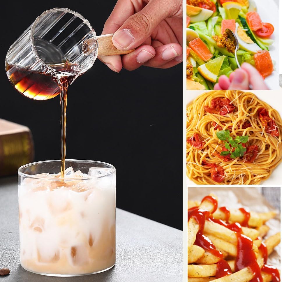 - Elegant Design: The ribbed glass design give this espresso measuring cup an elegant look/feel, wooden handle for a more comfortable grip, making it a long-lasting addition to your kitchen home and restaurant .