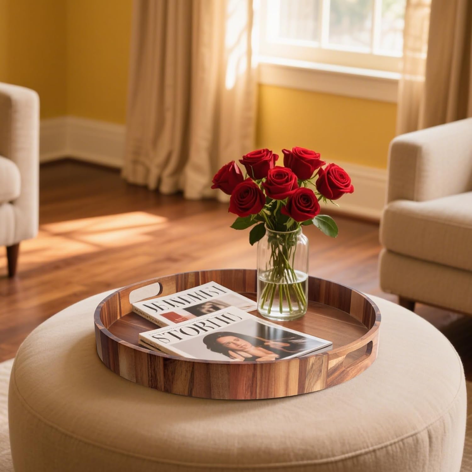 - Acacia Wooden Round Tray: This serving tray is made of high quality Acacia Wood, tray surface is hand-polished to ensure smoothness and finer corner grinding. Wipeable and easy to clean, simply wipe the tray with a damp cloth.