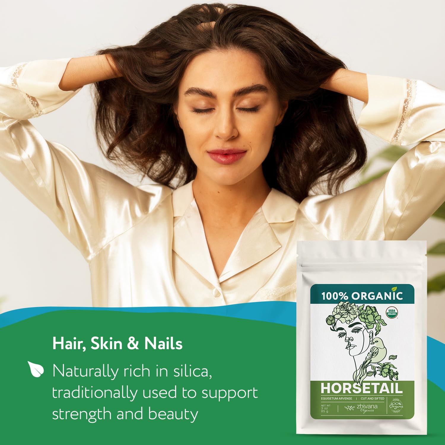 - 🌿 Traditionally Used in Herbal Practices – Horsetail has been historically used in wellness traditions for its naturally occurring silica and is often included in herbal infusions associated with supporting beauty and vitality.