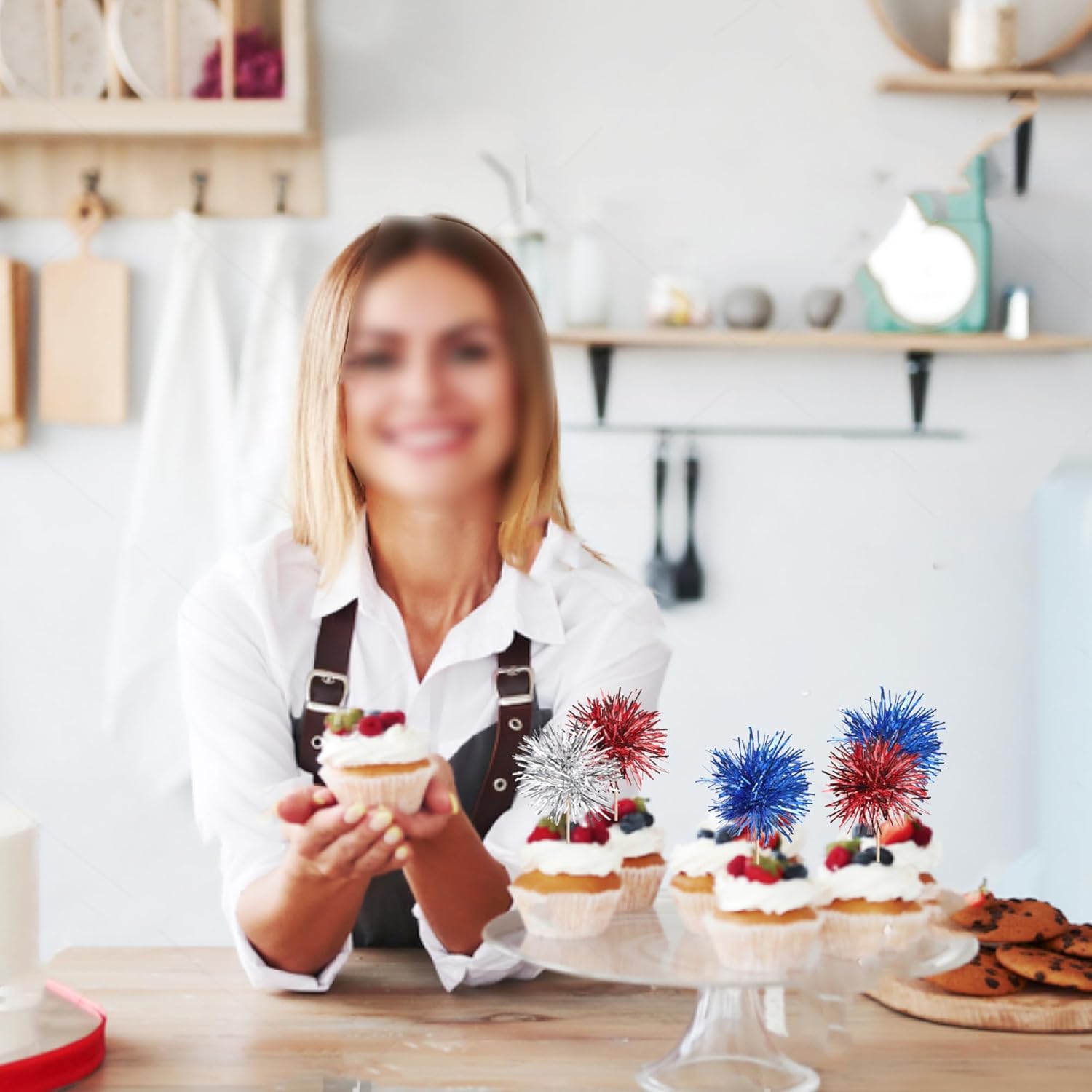 30 PCS Foil Firework Cupcake Toppers Sparkle Tinsel Cupcakae Picks 4th of July Decorations Cocktail Fruit Toothpick for Fireworks Theme Birthday Wedding Graduation Party Decor Supplies Blue Red Silver